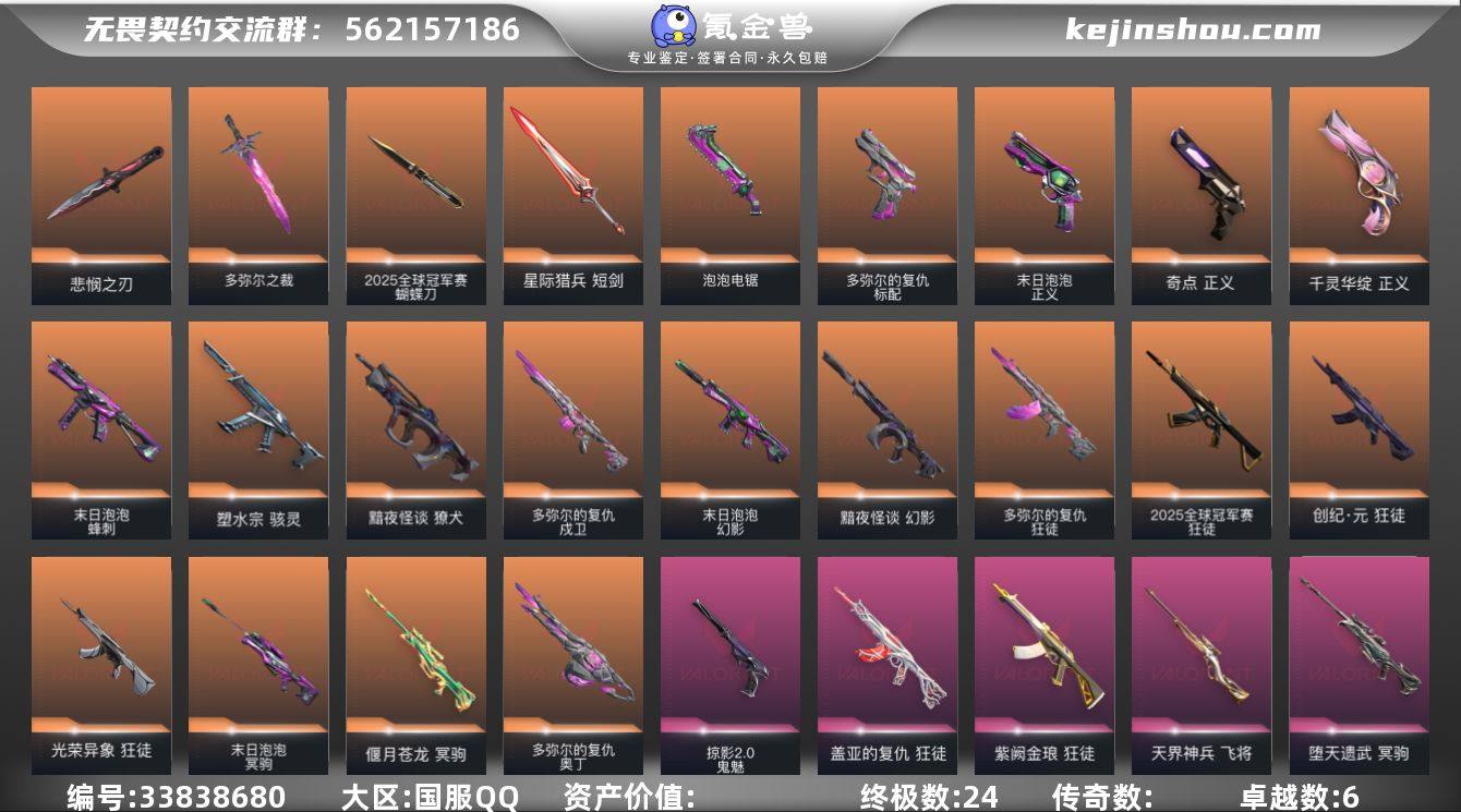 【PTWW3897】LV等级159/皮肤总价值49190/段位黄金/总皮肤数量67/刀皮数量6/枪皮数量61/套装数量5/具体详情请看图/2025全球冠军赛/无畏契约季前邀请赛套装/回火礼包// V25套装/多弥尔的复仇/末日泡泡套装/幻棱/炼狱/维斯/暮蝶/钛狐/壹决/铁臂/捷风/雷兹/幽影/不死鸟/贤者/猎枭/蝰蛇/零/芮娜/奇乐/尚勃勒/霓虹/斯凯/夜露/星礈/K/O/海神/盖可/黑梦/钢锁/2025全球冠军赛 蝴蝶刀/近战武器-碎心裂刃/无畏契约季前邀请赛 悲悯之刃/多弥尔之裁/泡泡电锯/星际猎兵 短剑/2025全球冠军赛 狂徒/狂徒-创·纪元/狂徒-光荣异象/多弥尔的复仇 狂徒/狂徒-盖亚的复仇/狂徒-紫阙金琅/幻影-黯夜怪谈/幻影-末日泡泡/多弥尔的复仇 戍卫/獠犬-黯夜怪谈/冥驹-偃月苍龙/冥驹-末日泡泡/冥驹-堕天遗武/飞将-天界神兵/莽侠-神中神罚/多弥尔的复仇 奥丁/骇灵-塑水宗/蜂刺-末日泡泡/多弥尔的复仇 标配/标配-超能偶像/正义-奇点/正义-千灵华绽/正义-末日泡泡/鬼魅-掠影2.0/鬼魅-星云暗涌/逆冲蛮牛 卡面/精灵大战 卡面/南瓜盛典 卡面/修车达人 卡面/正义的化身 卡面/终章:生意人麦宝 卡面/铁之华 卡面/时间到 卡面/最高舞台 卡面/声感陷阱设计图 卡面/Clutch 卡面/梦幻奶茶 卡面/无畏契约GO!第一卷:零 卡面/...