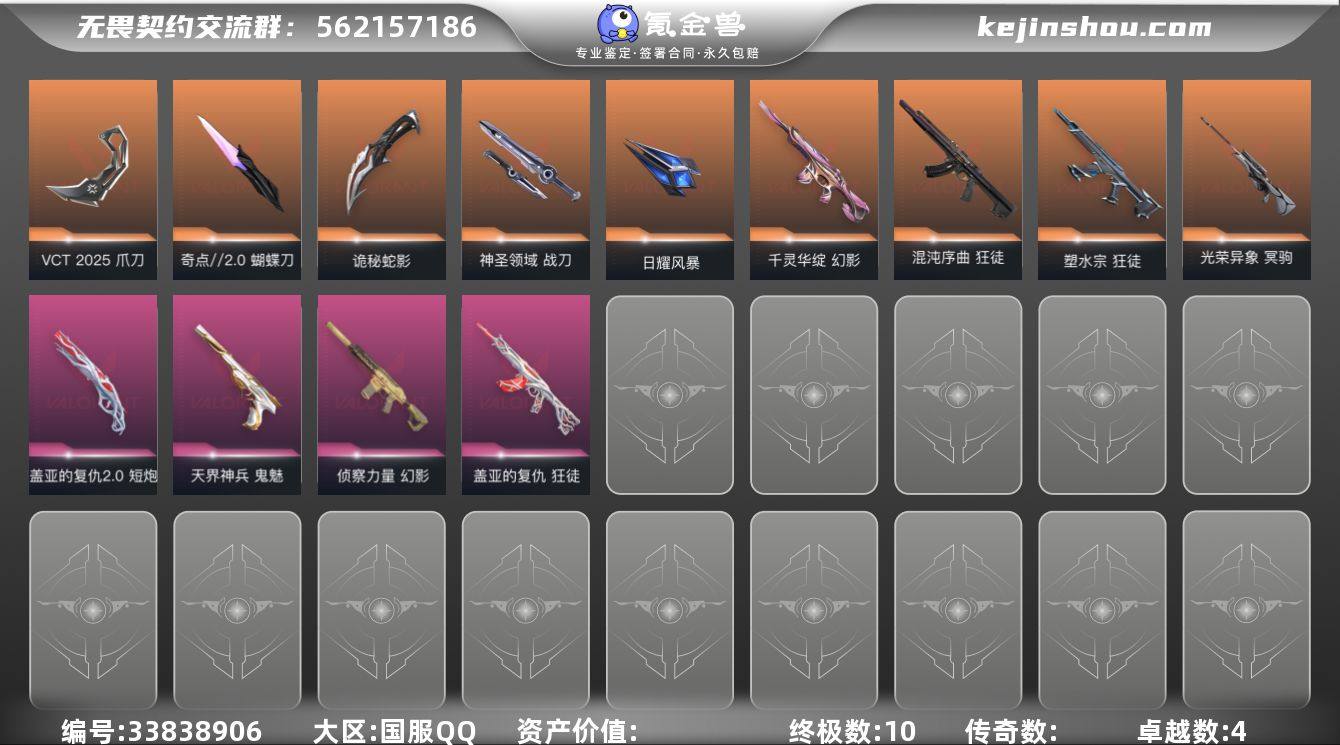 【PTWW4009】LV等级83/皮肤总价值22360/段位未定级/总皮肤数量51/刀皮数量6/枪皮数量45/套装数量1/具体详情请看图/VCT 2025赛季礼包/幻棱/炼狱/暮蝶/钛狐/壹决/铁臂/捷风/雷兹/幽影/不死鸟/贤者/猎枭/蝰蛇/芮娜/尚勃勒/夜露/盖可/蝴蝶刀-奇点//2.0/VCT 2025 爪刀/鬼丸国纲/诡秘蛇影/神圣领域 战刀/日耀风暴/狂徒-混沌序曲/狂徒-塑水宗/狂徒-盖亚的复仇/狂徒-诡秘蛇影/幻影-千灵华绽/幻影-侦察力量/幻影-神圣领域/幻影-末日之翼/戍卫-月球哨兵/戍卫-折光棱晶/獠犬-神圣领域/冥驹-光荣异象/冥驹-星云暗涌/飞将-末日之翼/莽侠-诡秘蛇影/莽侠-月球哨兵/战神-神圣领域/奥丁-末日之翼/判官-诡秘蛇影/雄鹿-月球哨兵/骇灵-星云暗涌/蜂刺-星云暗涌/蜂刺-折光棱晶/标配-折光棱晶/正义-游戏结束/正义-月球哨兵/鬼魅-天界神兵/鬼魅-诡秘蛇影/鬼魅-星云暗涌/狂怒-神圣领域/短炮-盖亚的复仇2.0/短炮-末日之翼/树懒大作战 卡面/红鳞松叶 卡面/无畏契约GO!第一卷:芮娜 卡面/无畏契约GO!第一卷:零 卡面/无垠星环 卡面/《双城之战》金克丝 卡面/代号红色 卡面/新兵报到 卡面/V契约 卡面/无畏契约 卡面/审判之爪 喷漆/买装还是存钱 喷漆/放下武器 喷漆/胜利属于无畏契约 喷漆/GLHF 喷漆/无畏...