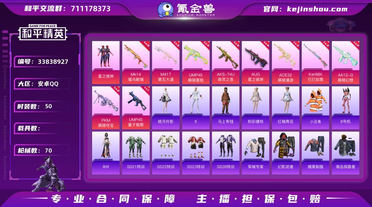 【小丑鱼】YXc29413-【可二次协助处理】【因赛季更新游戏段付以上号为准!】 安卓Q-1粉装10特效枪4热门50套装70枪皮 4印记 历史超级王牌10星 【1粉装】 星之彼岸 【10特效枪】 AKS-74U-森灵之息 (4级) Kar98K-巳巳如意 (3级) UMP45-量子极限 (1级) AUG-星之彼岸 (4级) M417-第五大道 (5级) Mk14-福马献瑞 (5级) AA12-G-萌骑幻想 (2级) PKM-萌骑夺宝 (2级) UMP45-萌骑冒险 (4级) ACE32-萌骑漫游 (3级) 【4热门】 8号机 小丑鱼 漫步者 破蛋小黄鸡 【1背包】 金羽特工背包