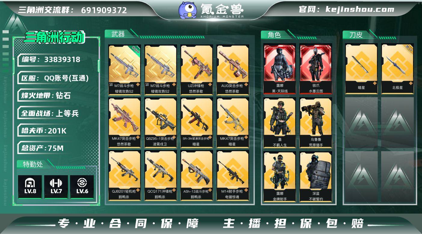 【SJZG4929】总资产75M/哈夫币20万/传说近战数1/传说枪皮数43/战场等级26/行动等级60/安全箱等时效性道具以游戏内数据为准,详情请看图/骇爪-水墨云图/露娜-黑·天际线/蜂医-送葬人·无题密令(S5)/无名-夜鹰(S4)/深蓝-不破誓约(S6)/红狼-电锯惊魂/露娜-金牌射手(S7)/乌鲁鲁-荒原猎手/蛊-不羁人生/近战-暗星/近战-北极星/近战-处刑者3级/近战-黑鹰/M7战斗步枪-棱镜攻势S2/优品B典藏武器外观-M7战斗步枪-棱镜攻势S2/M4A1突击步枪-阿米娅/AKM突击步枪-锦绣/QBZ95-1突击步枪-凌霄戍卫/ASh-12战斗步枪-鹅鸭杀/K416突击步枪-行动记录/AUG突击步枪-悠然茶歇/SG552突击步枪-运动员/AK-12突击步枪-夜鹰/AK-12突击步枪-特斯拉线圈/SCAR-H战斗步枪-水墨云图/SCAR-H战斗步枪-启航/CAR-15突击步枪-黑鹰坠落/CAR-15突击步枪-阿米娅/腾龙突击步枪-捞点薯条/腾龙突击步枪-万金泪冠/K437突击步枪-北极星/K437突击步枪-锦绣/KC17突击步枪-电锯惊魂/MK47突击步枪-悠然茶歇/MK47突击步枪-暗星/UZI冲锋枪-特斯拉线圈/UZI冲锋枪-悠然茶歇/SMG-45冲锋枪-锦绣/SR-3M紧凑突击步枪-特斯拉线圈/SR-3M紧凑突击步枪-暗星/勇士冲锋枪-能天使-午夜邮差/勇士冲锋枪-万金泪冠/QCQ171冲锋枪-北极星/QCQ171冲锋枪-鹅...