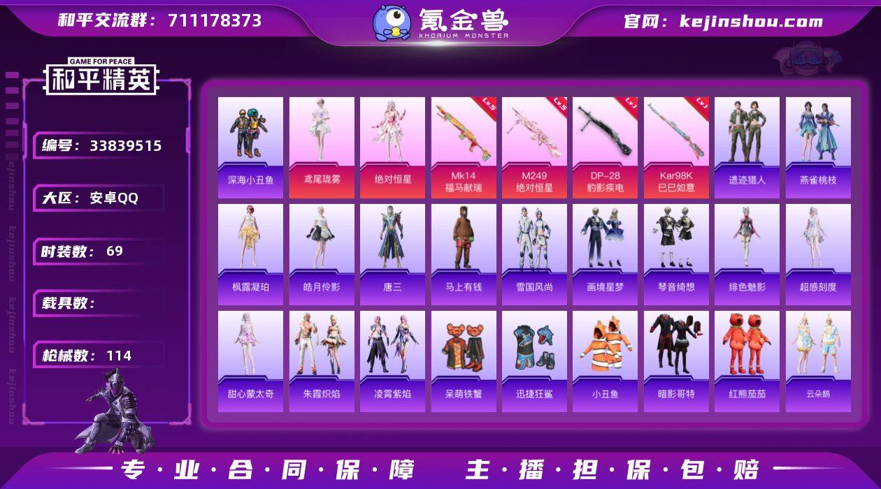 五一特惠成本价 清库存 J3494 【性价比小号】2粉 4特 红熊茄茄 暗影哥特 小丑鱼 深海小丑鱼 珑雾 恒星2 满级枪*2 地铁满天赋 收藏家等级 安卓手Q-2粉装-4特效枪-4粉色飞行器-28244热力值-3王牌印记-69套装-114枪皮 【热门品类】:套装-深海小丑鱼,套装-小丑鱼,套装-暗影哥特,套装-红熊茄茄 【粉色套装】:角色-绝对恒星,角色-鸢尾珑雾 【粉色枪皮等级】:Kar98K-巳巳如意(一级),Mk14-福马献瑞(五级),M249-绝对恒星(五级),DP-28-豹影疾电(一级) 【粉色枪皮】:Kar98K-巳巳如意,Mk14-福马献瑞,M249-绝对恒星,DP-28-豹影疾电 【粉色飞行器】:绝对恒星飞行器,炫彩糖果飞行器,天空之门飞行器,纱华羽翼飞行器 【粉色降落伞】:绝对恒星降落伞,冷漠罗丽降落伞,绯穹魔姬降落伞,炫彩糖果降落伞,虹云熊熊降落伞,虎痴许褚降落伞,千仞雪降落伞,鸢尾珑雾降落伞,百变纱华降落伞 【稀有套装】:角色-超感刻度,角色-甜心蒙太奇,套装-雪国风尚,套装-炫彩糖果,套装-马上有钱,套装-遗迹猎人,套装-云朵鹅,套装-雪绒豹,角色-绛羽幽主,套装-折梦之诗,套装-朱霞炽焰,套装-凌霄紫焰,角色-绯色魅影,套装-画境星梦,套装-琴音绮想,角色-唐三,角色-枫露凝珀,角色...