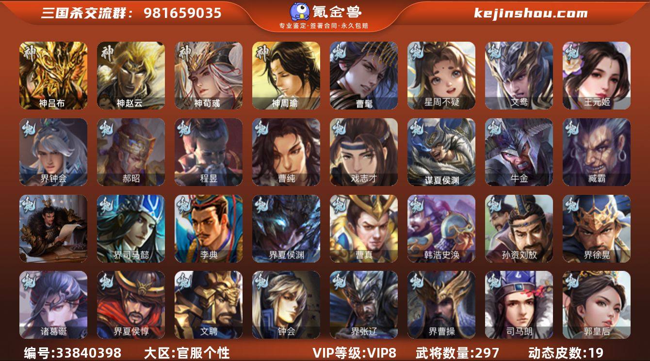 【14788640】官阶:骠骑将军;VIP等级:VIP8;史诗武将数量:32;动态皮肤数量:19;武将总数:297;史诗宝珠数量:26;将魂数量:8859;神将:3;魏国史诗武将:10;蜀国史诗武将:9;吴国史诗武将:6;群史诗武将:8