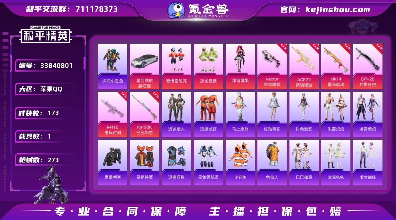 【LHPX2774】精品小号 19印记【特价出售/店主推荐--热门套装小丑鱼】苹果手Q-3粉装-6特效枪-1载具-1粉色飞行器-76881热力值-19王牌印记-173套装-273枪皮【热门品类】:粉装-音爆索尼克,套装-深海小丑鱼,套装-小丑鱼,套装-龟仙人【粉色套装】:粉装-恐龙拽拽,粉装-音爆索尼克,角色-绯穹魔姬【粉色枪皮等级】:M416-电玩时刻(五级),ACE32-萌骑漫游(五级),Vector-绯穹魔姬(七级),Kar98K-巳巳如意(五级),Mk14-福马献瑞(五级),DP-28-豹影疾电(五级)【粉色载具】:星河领航(磐石银)【粉色枪皮】:M416-电玩时刻,ACE32-萌骑漫游,Vector-绯穹魔姬,Kar98K-巳巳如意,Mk14-福马献瑞,DP-28-豹影疾电【粉色飞行器】:太空嘟嘟飞行器