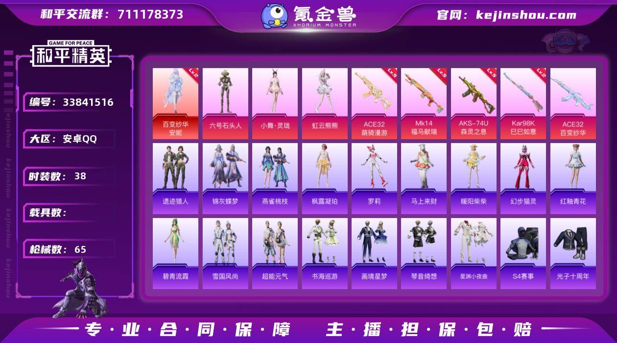 【LHPX2691】精品小号 可二次【特价出售/店主推荐】安卓 手Q-1神装-3粉装-5特效枪-4粉色飞行器-21462热力值-2王牌印记-38套装-65枪皮【红色神装等级】:百变纱华-安妮(二级)【粉色套装】:角色-虹云熊熊,人物-小舞·灵珑,角色-六号石头人【粉色枪皮等级】:ACE32-萌骑漫游(五级),AKS-74U-森灵之息(五级),Kar98K-巳巳如意(二级),Mk14-福马献瑞(五级)【粉色枪皮】:ACE32-萌骑漫游,ACE32-百变纱华,AKS-74U-森灵之息,Kar98K-巳巳如意,Mk14-福马献瑞【粉色飞行器】:炫彩糖果飞行器,小舞飞行器,六号石头人飞行器,纱华羽翼飞行器