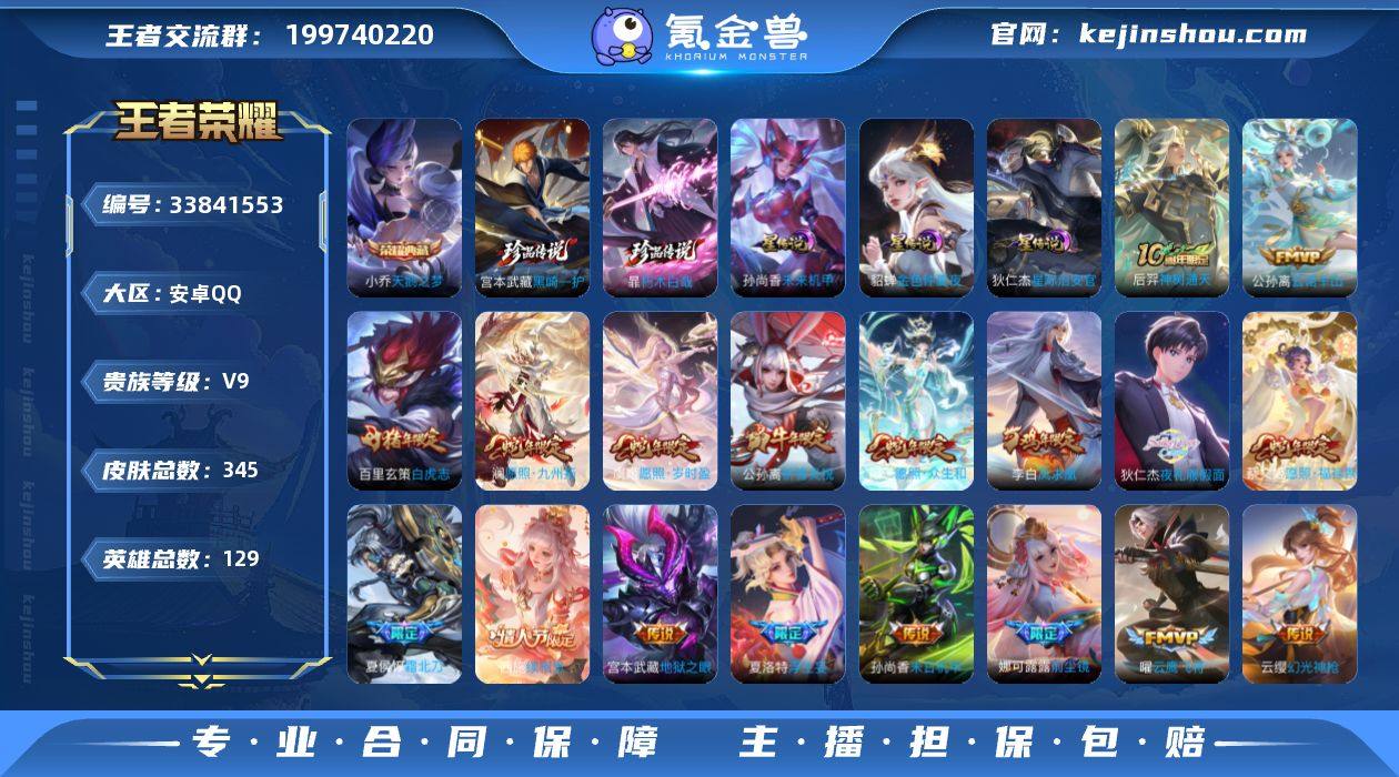 精品皮肤号-百星印记-3星传说-2金标-26个性按键-荣耀水晶抽奖次数296-安卓Q-V9-最强王者段位-128英雄-345皮肤-1典藏皮肤-2珍品传说-34传说-92史诗 【英雄全皮】:孙权全皮,娜可露露全皮,敖隐全皮,鲁班大师全皮,暃全皮,戈娅全皮,空空儿全皮 【荣耀典藏】:小乔天鹅之梦 【珍品传说】:宫本武藏黑崎一护,暃朽木白哉 【传说皮肤】:后羿神树通天,公孙离云诺千山,西施续相思,妲己愿照众生和,澜愿照九州拓,蔡文姬愿照福禄聚,虞姬愿照岁时盈,云缨幻光神枪,桑启鸣野蒿,庄周牧神诗旅,夏侯惇霜北刀,孙膑小动物乐团,狄仁杰夜礼服假面,马可波罗妄想实况,夏洛特浮生妄,李白诗剑行,百里守约碎云,橘右京枫霜尽,娜可露露前尘镜,公孙离祈雪灵祝,虞姬启明星使,曜云鹰飞将,刘备时之恋人,张良黄金白羊座,干将莫邪久胜战神,百里玄策白虎志,梦奇胖达荣荣,后羿黄金射手座,貂蝉仲夏夜之梦,李白凤求凰,孙尚香末日机甲,宫本武藏地狱之眼,孙悟空地狱火,狄仁杰超时空战士 【限定皮肤】:白起狰,夏侯惇霜北刀,暃埋骨钱,蒙犽顽岩魄,姜子牙天穹之誓,狄仁杰阴阳师,虞姬凯尔特女王,赵云皇家上将,妲己时之奇旅,高渐离玩趣恶龙,钟无艳超时空战士,芈月重明,...
