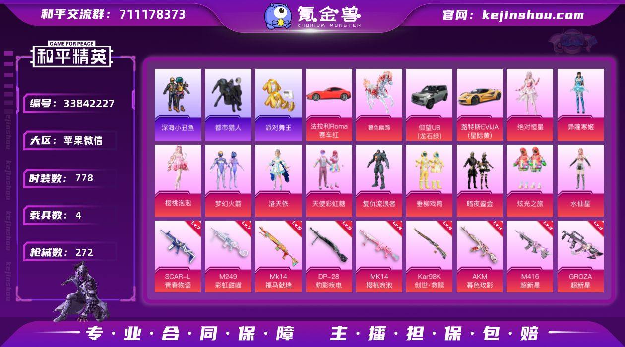 【小素材号/店长推荐】11粉11枪4车 梦幻火箭 金鞋 都市 星河浪客 情公主 浪漫天命 暗影哥特 M416-超新星 深海小丑鱼 实名: 可修改 时装数: 778 载具数: 4 枪械数: 272 战备数: 213 热门装扮: 梦幻火箭(新101),深海小丑鱼,天使彩虹糖,迅捷狂鲨,鹰眼刺客,都市猎人,洛天依,复仇流浪者,垂柳戏鸭,奶芙汪汪,暗夜鎏金,派对舞王,炫光之旅,水仙星,樱桃泡泡,异瞳寒姬,绝对恒星 载具: 路特斯EVIJA(星际黄),仰望U8(龙石绿),暮色幽蹄,法拉利Roma(赛车红) 稀有枪皮: SCAR-L青春物语,M249彩虹甜喵,M416超新星,GROZA超新星,DP-28圣堂之誓,Kar98K创世·救赎,MK14-樱桃泡泡,DP-28-豹影疾电,AKM-暮色玫影,PKM-萌骑夺宝
