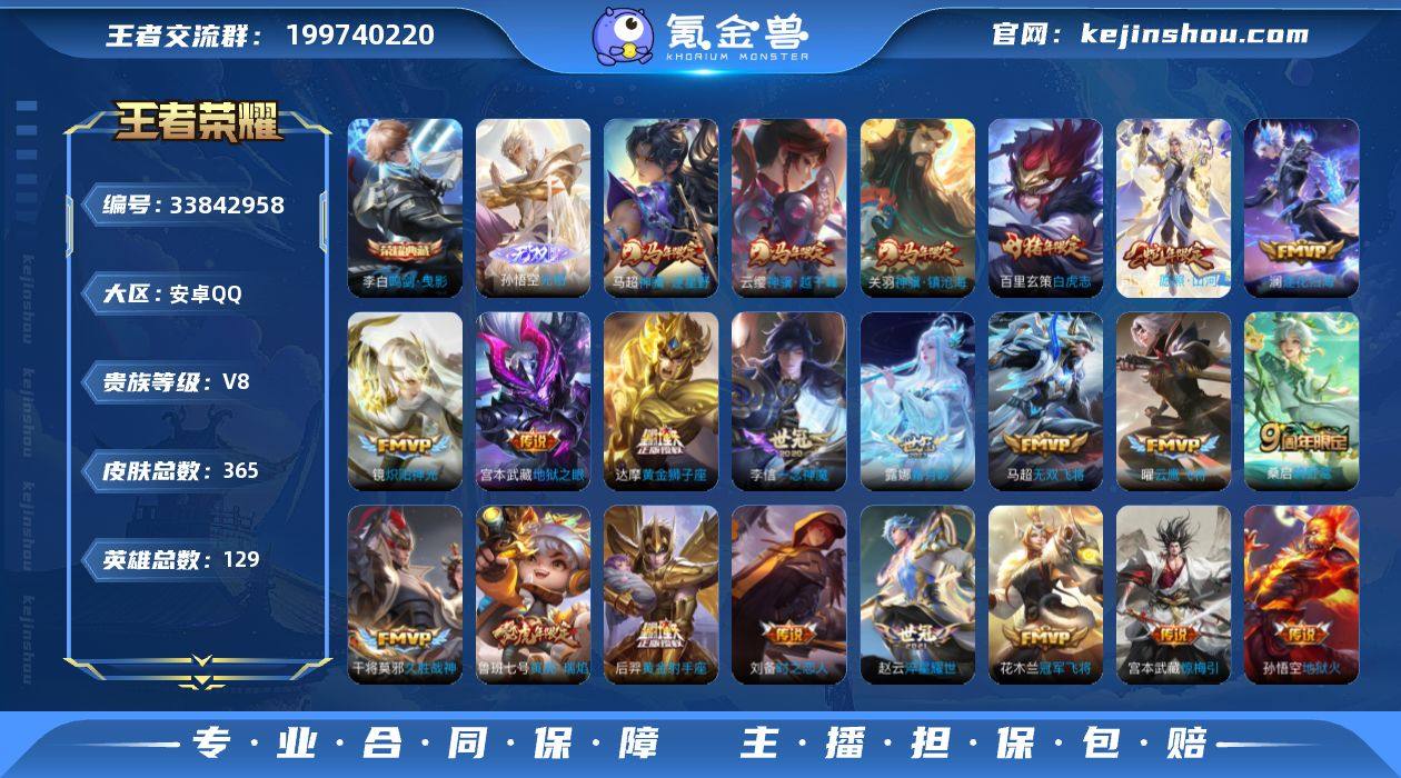 实名: 可修改 性别: 男号 贵族等级: V8 英雄数: 129 皮肤数: 365 荣耀水晶: 鸣剑·曳影 无双皮: 无相 传说皮: 黄金狮子座,黄金射手座,冠军飞将,云鹰飞将,绛天战甲,久胜战神,炽阳神光,一念神魔,地狱火,地狱之眼,时之恋人-刘备,淬星耀世,无双飞将,惊梅引,霜月吟,澜逐花归海,神骥·越千峰,神骥·逐星野,神骥·镇沧海 限定皮: 李小龙,梁祝,白虎志,寅虎·瑞焰,高山流水,孙行者,猪悟能,傲雪梅枪,寅虎·展翼,五谷丰年,山海·玄木吟,鸣野蒿,愿照·山河定 亮点: 【优质装备】:鸣剑·曳影,黄金狮子座,黄金射手座,冠军飞将,云鹰飞将(小将军),绛天战甲(鸡嘴战神),久胜战神,炽阳神光,一念神魔,地狱火,地狱之眼,时之恋人-刘备(电焊工),淬星耀世,无双飞将,惊梅引,霜月吟,澜逐花归海,涂山容容