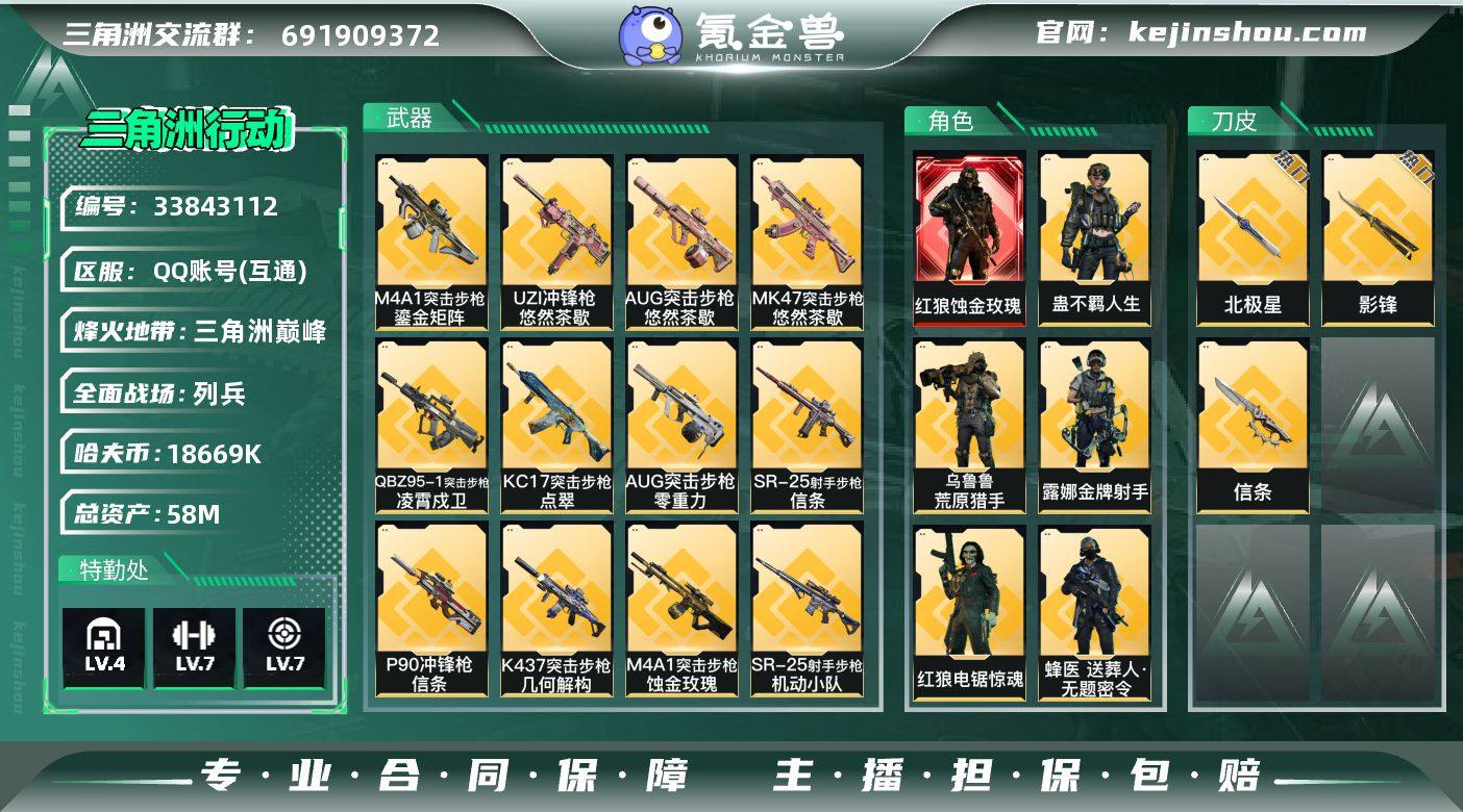 A12655/包人脸/QQ区【总资产:58M+近战北极星+近战影锋+近战信条+红狼蚀金玫瑰+满体满负】/烽火等级:60级/全面战场:7级/纯币:18669K/三角券加币:158(三角币60+三角券98)【近战-北极星/近战-影锋/近战信条】【红狼-蚀金玫瑰/蛊-不羁人生/红狼-电锯惊魂/露娜-金牌射手/乌鲁鲁-荒原猎手/蜂医-无题密令】/部门:23131/特勤等级3333(技术中心3级/工作台3级/制药台3级/防具台3级/仓库4级/指挥中心5级/训练中心7级/靶场7级)(流动资产:39.5M)M4A1突击步枪-蚀金玫瑰/M4A1突击步枪鎏金矩阵/AKM突击步枪-锦绣/QBZ95-1突击步枪-凌霄戍卫/KC17突击步枪-电锯惊魂/橙色挂饰x6/段位:三角洲巅峰/详细看图