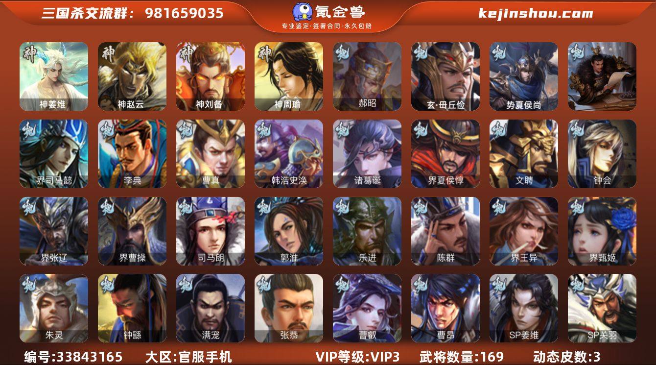 【JYSGS379】官阶:先锋及以下 VIP等级:VIP3级 史诗武将数:7 动态皮肤数:3 武将总数:169 史诗宝珠数:0 元宝数:511 将魂数:1874 /神姜维/神赵云/神刘备/郝昭/张星彩/谋陆逊/周处/势夏侯尚/界曹操/界司马懿/界夏侯惇/界张辽/界甄姬/钟会/郭淮/满宠/曹真/韩浩史涣/陈群/曹叡/钟繇/界王异/诸葛诞/曹昂/SP关羽/SP姜维/文聘/乐进/司马朗/李典/张恭/朱灵/玄毌丘俭/孟达/华雄/袁术/界华佗/界吕布/界袁术/界颜良文丑/公孙瓒/伏皇后/李儒/蔡夫人/公孙渊/界公孙瓒/伏完/张宝/SP赵云/蹋顿/张鲁/刘繇/乐就/李傕郭汜/星张郃/神周瑜/势陈祗/谋张飞/界刘备/界张飞/界赵云/界黄月英/界伊籍/关兴张苞/廖化/关平/简雍/刘封/吴懿/周仓/张松/界法正/界关兴张苞/界马岱/界张嶷/马良/夏侯霸/SP孙尚香/SP徐庶/傅肜/甘夫人/孙翊/蒋钦/界甘宁/界吕蒙/界黄盖/界周瑜/界大乔/界陆逊/界孙权/程普/韩当/潘璋马忠/虞翻/孙鲁班/顾雍/孙休/朱治/界顾雍/诸葛瑾/孙鲁育/潘濬/吕岱/张布/陆逊-猪年圣诞(动态)/李儒-业火毒计(动态)