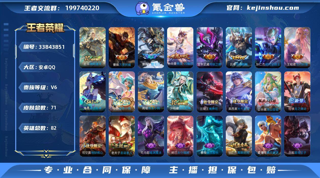 实名: 可修改 性别: 男号 贵族等级: V6 英雄数: 82 皮肤数: 71 传说皮: 地狱之眼,乞巧织情,超时空战士-狄仁杰,乘龙·问璇玑,万灵伏威,神树通天 限定皮: 游园惊梦,圣诞老人,怒海麟威,夏侯惇霜北刀 亮点: 【优质装备】:地狱之眼,乞巧织情,超时空战士-狄仁杰,涂山容容,万灵伏威