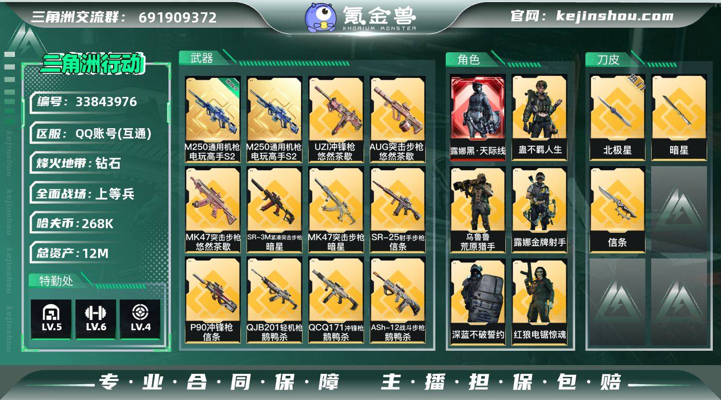 【sjs11250】【⭐ 可二次 卖号能回血 1红皮 3刀皮1典藏 精品成品号 纯绿无处罚 】 sjs11250 12m总资产-268k哈夫币-60烽火等级-钻石-50战场等级-上等兵 【干员外观】:露娜-黑·天际线,蜂医-送葬人·无题密令,无名-夜鹰,深蓝-不破誓约,红狼-电锯惊魂,露娜-金牌射手,乌鲁鲁-荒原猎手,蛊-不羁人生 【近战皮肤】:近战-暗星,近战-北极星,近战-信条,近战-黑鹰 【典藏外观】:M250通用机枪-电玩高手S2 【典藏外观成色】:M250通用机枪-电玩高手S2(优品S) 【传说外观】:M4A1突击步枪-阿米娅,ASh-12战斗步枪-鹅鸭杀,AUG突击步枪-悠然茶歇,M7战斗步枪-小肥柴,SG552突击步枪-运动员,AK-12突击步枪-夜鹰,AK-12突击步枪-特斯拉线圈,SCAR-H战斗步枪-启航,G3战斗步枪-骑士,CAR-15突击步枪-阿米娅,腾龙突击步枪-捞点薯条,K437突击步枪-北极星,KC17突击步枪-电锯惊魂,MK47突击步枪-悠然茶歇,MK47突击步枪-暗星,P90冲锋枪-信条,UZI冲锋枪-特斯拉线圈,UZI冲锋枪-悠然茶歇,SMG-45冲锋枪-骑士,SR-3M紧凑突击步枪-特斯拉线圈,SR-3M紧凑突击步枪-暗星,勇士冲锋枪-能天使-午夜邮差,QCQ171冲锋枪-北极星,QCQ171冲锋枪-鹅鸭杀,QCQ171冲锋枪-不羁人生,725双管霰弹枪-...