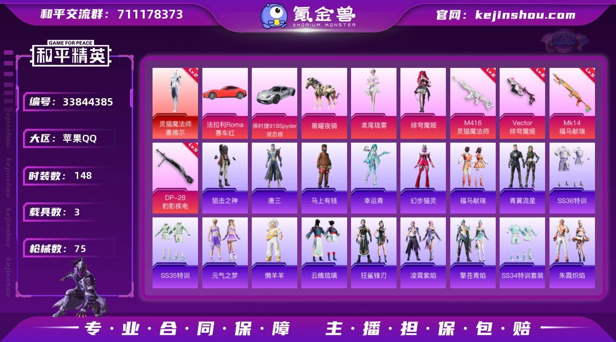 实名: 不可修改 时装数: 148 载具数: 3 枪械数: 75 战备数: 3 神级装扮: 灵猫魔法师-塞维尔 热门装扮: 呆萌铁蟹,绯穹魔姬,鸢尾珑雾 载具: 黑曜夜骑,保时捷918Spyder(液态银),法拉利Roma(赛车红) 稀有枪皮: M416-灵猫魔法师,Vector-绯穹魔姬,DP-28-豹影疾电,MK14-福马献瑞 亮点: 【优质装备】:灵猫魔法师-塞维尔,二级灵猫魔法师-塞维尔