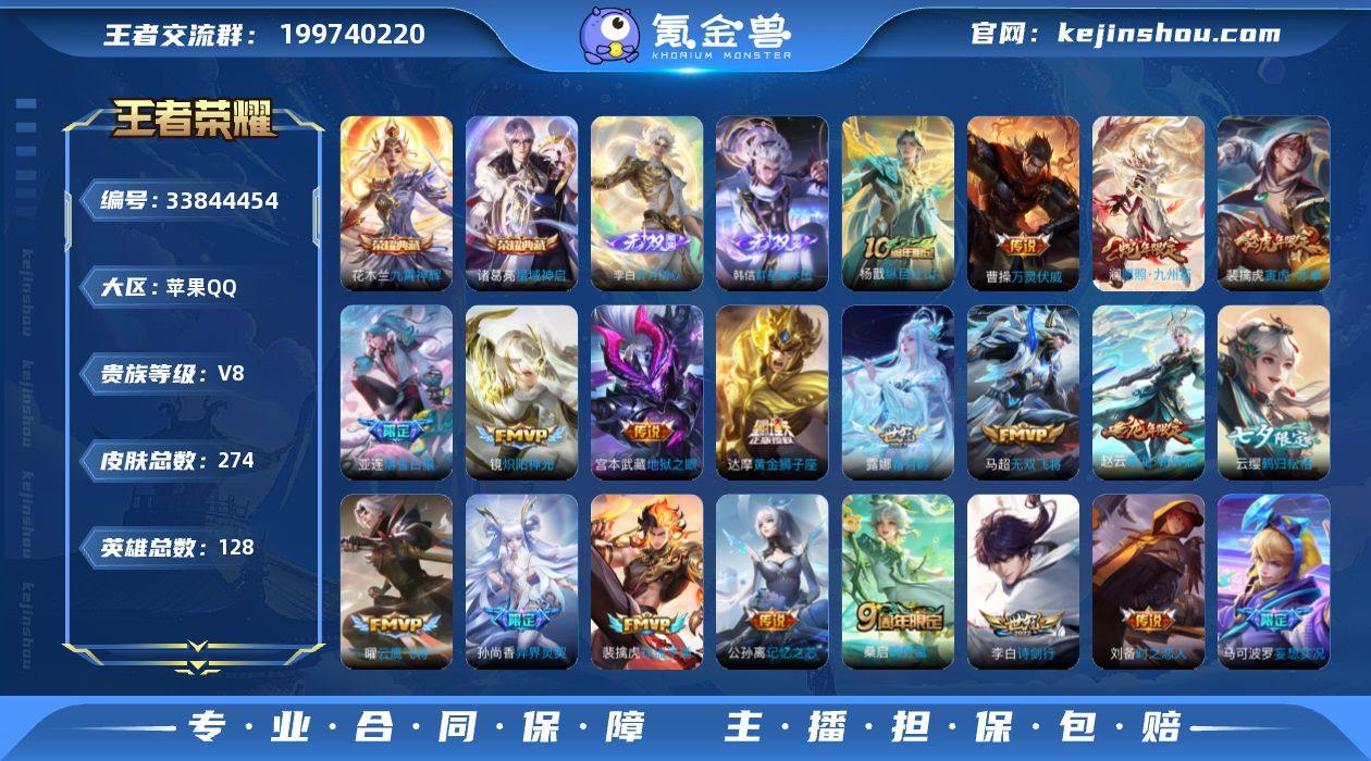 实名: 可修改 性别: 男号 贵族等级: V8 英雄数: 128 皮肤数: 274 荣耀水晶: 星域神启,九霄神辉 无双皮: 碎月剑心,韩信群星魔术团 传说皮: 黄金狮子座,冠军飞将,云鹰飞将,炽阳神光,地狱之眼,时之恋人-刘备,超时空战士-狄仁杰,无双飞将,记忆之芯,妄想实况,鹤归松栖(云缨),霜月吟,乘龙·铭钟鼎,落雪白狼,祥瑞亨通,万灵伏威,纵目迁山 限定皮: 遇见飞天,李小龙,御风骁将,辉光之辰,异界灵契-孙尚香,至尊宝,高山流水,孙行者,傲雪梅枪,寅虎·赤拳,诗剑行,鸣野蒿,愿照·九州拓 亮点: 【优质装备】:星域神启(倪克斯贼亮),九霄神辉(木兰典藏),碎月剑心(李白无双),韩信群星魔术团(韩信无双),黄金狮子座,冠军飞将,云鹰飞将(小将军),炽阳神光,地狱之眼,时之恋人-刘备(电焊工),超时空战士-狄仁杰,无双飞将,记忆之芯(机甲兔),妄想实况,鹤归松栖(云缨),霜月吟,万灵伏威