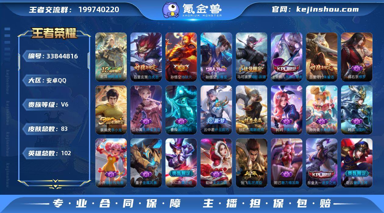 【王者荣耀】珍品无双0 典藏0 无双0 珍品传说0 传说3 史诗22 英雄107 皮肤83 贵族0级 传说皮肤:地狱火|白虎志|神树通天__稀有限定:至尊宝|朱雀志|李小龙|暗影游猎|海滩派对|海盐诗旅|皇家上将|混沌棋|剑破天穹|魔术师|擒涛扼浪|驱傩正仪|醍醐杖|天狼绘梦者|天穹祈灯|万华元夜|纤云弄巧|演武夺筹|疑决卦|阴阳师|逐梦之光|白龙吟|缤纷独角兽|节奏热浪|金属风暴|魅力维加斯|圣诞恋歌|水果甜心|鹰眼统帅|幽灵船长|修罗|孙尚香-时之恋人|无限星赏官|御霄|原初探秘者|云中旅人|单词大作战|死神来了|鹤鸣心笺__优质皮肤:午夜歌剧院|绯红之刃|启蛰|伊势巫女|第七人偶|地府判官|赤焰之缨|特种部队|精灵王|龙域领主|魇语军师|加勒比小姐|精灵公主|修竹墨客|潮玩探月行|瓷语鉴心|鲨炮海盗猫|幻想奇妙夜|兔女郎|死亡骑士|玩偶对对碰|忍·炎影|乐园追猎者|牛运亨通|幻泉雾影|次元傲视|拳王|大发明家|猪八戒-西部大镖客|乱世虎臣|孙悟空-西部大镖客|汉昭烈帝|乓乓大师|盾山-圆桌骑士|猎兽之王|蒙犽-归虚梦演|曜-归虚梦演|沉稳之力|熔金海岸|妄想特派__贵族等级:无贵族等级__王者段位:荣耀黄金【可二次】 神树通天,白虎志,地狱火,至尊宝,朱雀志,