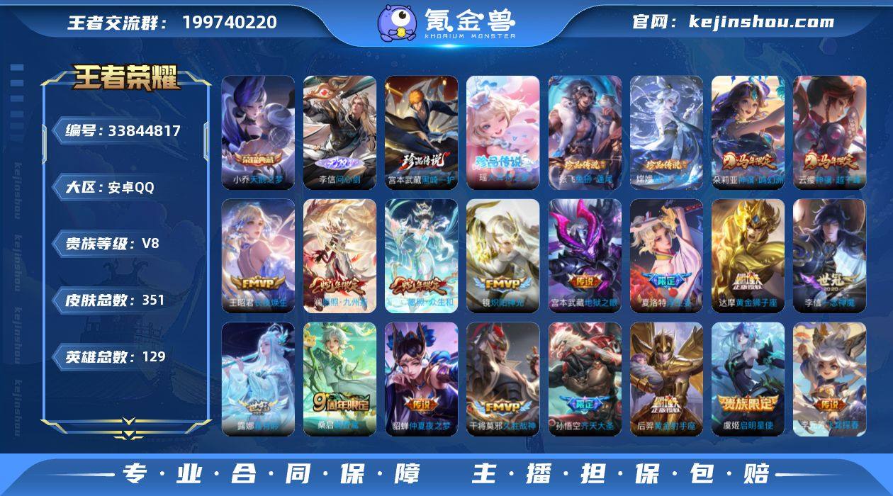【王者荣耀】珍品无双0 典藏1 无双2 珍品传说4 传说23 史诗112 英雄129 皮肤351 贵族8级 荣耀典藏:天鹅之梦__无双皮肤:雪境奇遇|问心剑__珍品传说:器灵·落星盏|兔狲·蓬尾|大耳狗之梦|黑崎一护__传说皮肤:鸣野蒿|绛天战甲|炽阳神光|启明星使|地狱之眼|仲夏夜之梦|久胜战神|黄金狮子座|狄仁杰-超时空战士|黄金射手座|黄金白羊座|一念神魔|飞鸢探春|浮生妄|孙尚香-末日机甲|齐天大圣|霜月吟|愿照·九州拓|愿照·众生和|长夜焕生|神骥·鸣幻洲|神骥·越千峰__稀有限定:寅虎·心曲|御风骁将|至尊宝|大圣娶亲|李小龙|梁祝|时之彼端|狮舞东方|暗影游猎|白昼王子|百木心枪|繁星吟游|海滩派对|航海奇遇记|皇家上将|混沌棋|凯尔特女王|狂想玩偶喵|蓝屏警告|黎明之约|迷踪丽影|魔术师|奇幻香踪|穷奇|驱傩正仪|朔风刀|饕餮|醍醐杖|天狼狩猎者|万华元夜|无心|纤云弄巧|星空之诺|演武夺筹|疑决卦|阴阳师|银河之约|御旌|御銮|御狮|原初追逐者|云间偶戏|暗夜贵公子|暗隐猎兽者|暗渊魔法|缤纷独角兽|冰冠公主|冰雪圆舞曲|乘风破浪|大乔-猫狗日记|德古拉伯爵|地狱岩魂|电玩小子|浮梦罗烟|功夫厨神|鬼剑武藏|黄金分割率|箭羽风息|节奏热浪|金属风暴|乐园奇幻夜|龙骑士|吕布-末日机甲|魅力维加斯|魅语|...