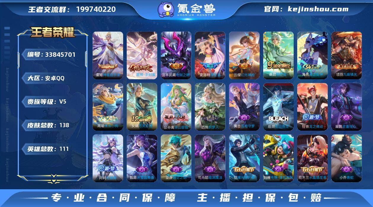 实名: 可修改 性别: 男号 贵族等级: V5 英雄数: 111 皮肤数: 138 荣耀水晶: 神鉴启示录 传说皮: 地狱之眼,浮生妄,幻光神枪 限定皮: 鸣野蒿,逐霄战戟,愿照·岁时盈 亮点: 【优质装备】:神鉴启示录,地狱之眼,浮生妄,涂山容容