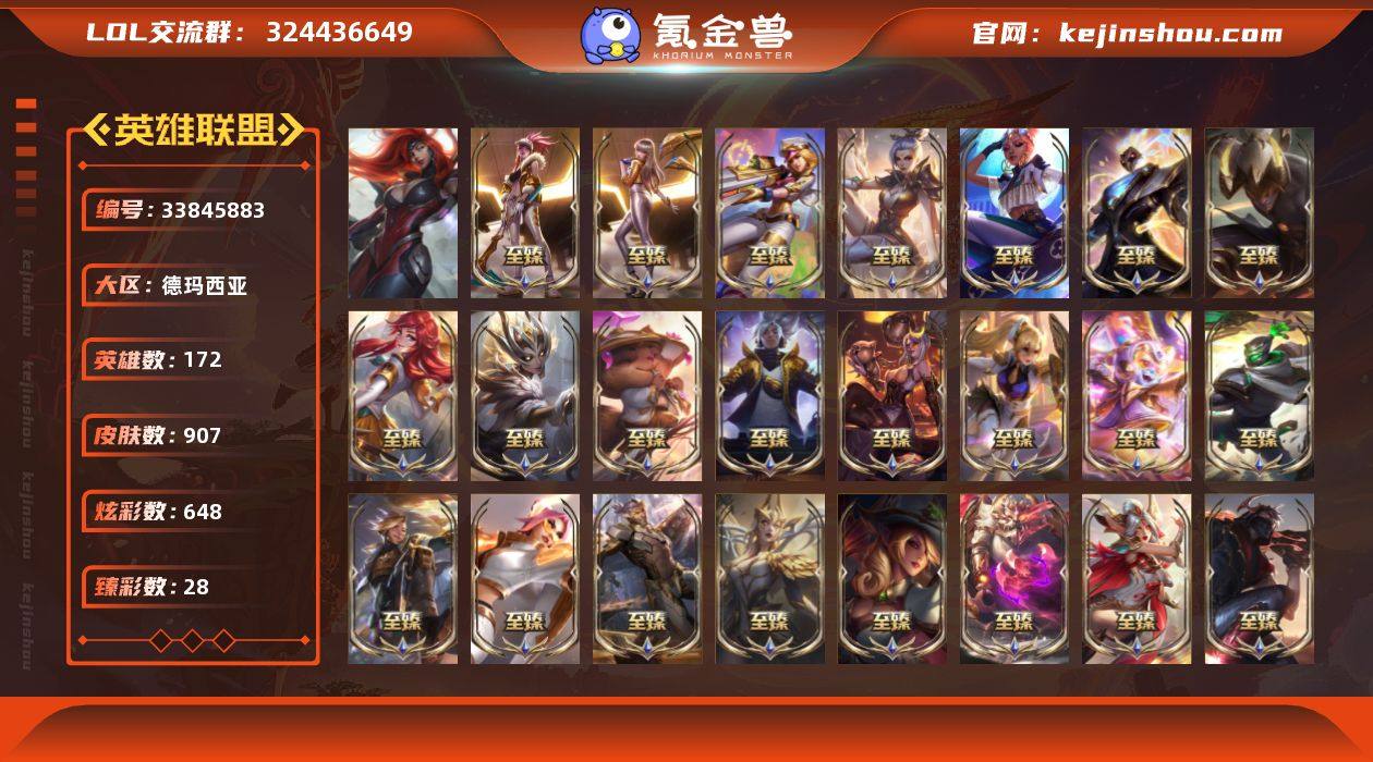 LOL德玛西亚907皮+CF17V连体号 全英雄本人实名可改 1. 英雄联盟部分(德玛西亚网通) - 全英雄:172/172 - 皮肤总数:907个,炫彩648个,臻彩28个 - 稀有度:神话63个(含大量至臻/海克斯)、限定108个、传说96个、史诗195个、终极1个、典藏2个 - 亮点:高质量神话皮多,收藏价值拉满,常用英雄皮肤齐全 2. 穿越火线部分(河北一区) - 英雄级武器:17把(含毁灭、雷神、黑武士、沙鹰修罗、擎天、王者之怒、天罚、屠龙、沙鹰天神、苍鸣雷神、碧霄极光等) - 王者武器:1把(王者之怒) - 音效卡:4张(含天罚、屠龙、Barrett-碧霄极光、M4A1-苍鸣雷神) - 角色:53个(含兰限定版、青霞仙子、斗烈龙骑等) - 亮点:爆破主流武器齐全,带音效卡,实用价值很高