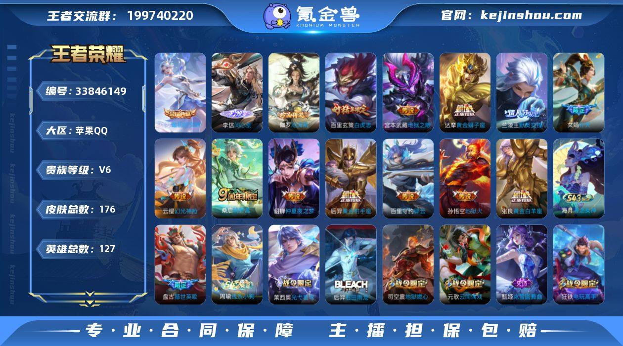 实名: 可修改 性别: 女号 贵族等级: V6 英雄数: 127 皮肤数: 176 荣耀水晶: 最初的交响 无双皮: 问心剑 珍品传说: 沧流箭 传说皮: 黄金狮子座,黄金射手座,黄金白羊座,地狱火,仲夏夜之梦,地狱之眼,碎云,幻光神枪 限定皮: 李小龙,游园惊梦,逐梦之影,白虎志,默契交锋-兰陵王,霸王别姬-项羽,高山流水,补天,五谷丰年,鸣野蒿,逐霄战戟 亮点: 【优质装备】:最初的交响(伽罗典藏),黄金狮子座,黄金射手座,黄金白羊座,地狱火,仲夏夜之梦(大飞蛾),地狱之眼,碎云,问心剑,沧流箭