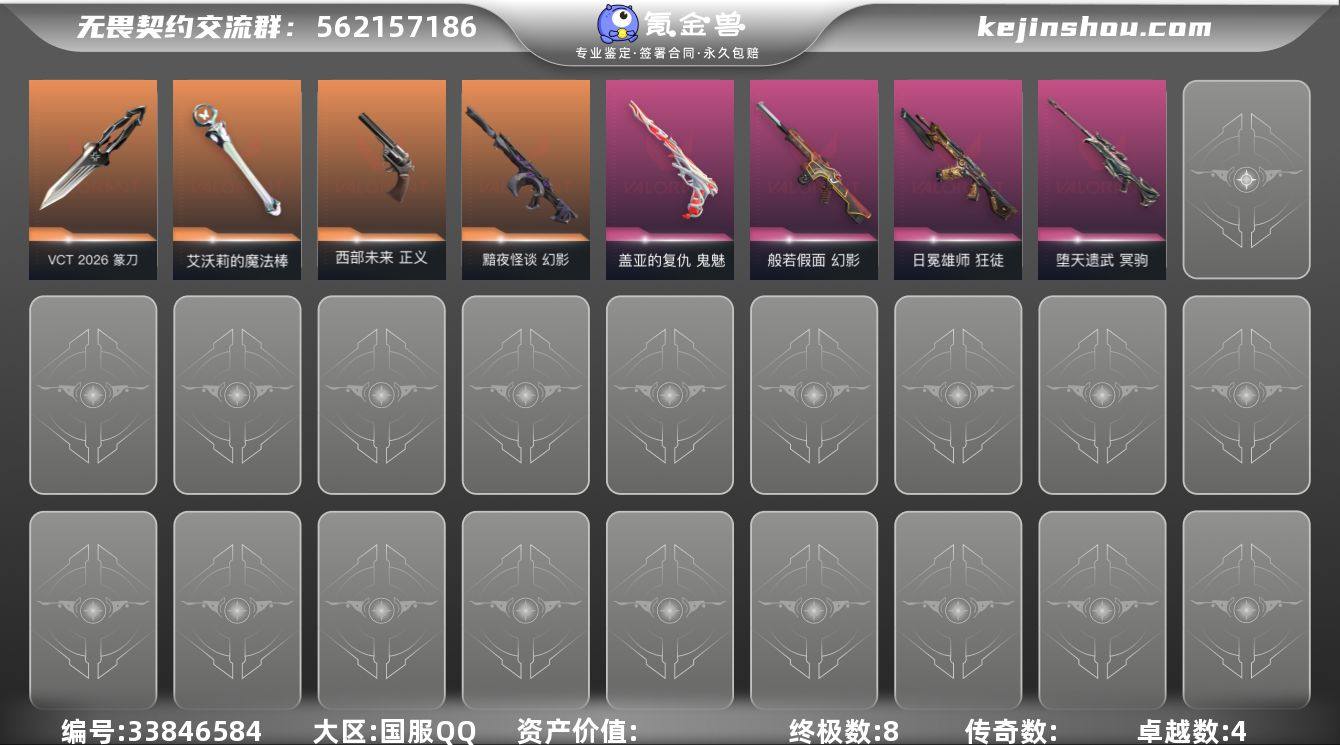 【套装】:VCT 2026 赛季套装,纸间折影套装【英雄】:幻棱,炼狱,维斯,暮蝶,钛狐,壹决,铁臂,捷风,雷兹,幽影,不死鸟,贤者,猎枭,蝰蛇,零,芮娜,奇乐,尚勃勒,霓虹,斯凯,夜露,星礈,K/O,海神,盖可,黑梦,钢锁【近战武器】:近战武器-蒙太奇 战斧,近战武器-素竹扇,近战武器-VCT 2026 篆刀,近战武器-穿花蝴蝶,近战武器-艾沃莉的魔法棒【狂徒】:狂徒-日冕雄师,狂徒-纸间折影【幻影】:幻影-黯夜怪谈,幻影-般若假面,幻影-蒙太奇【冥驹】:冥驹-堕天遗武【飞将】:飞将-纸间折影【战神】:战神-蒙太奇【骇灵】:骇灵-蒙太奇【蜂刺】:蜂刺-纸间折影【追猎】:追猎-纸间折影【正义】:正义-西部未来【鬼魅】:鬼魅-盖亚的复仇【狂怒】:狂怒-蒙太奇【卡面】:唱片的故事 卡面,无畏契约:尚勃勒 卡面,瓦娃脸雪糕 卡面 ,无畏契约GO!第一卷:芮娜 卡面,无畏契约GO!第一卷:零 卡面,无垠星环 卡面,《双城之战》金克丝 卡面,蝰蛇vs幽影 卡面,黑影先生的咖啡! 卡面,代号红色 卡面,新兵报到 卡面,V契约 卡面,无畏契约 卡面【喷漆】:黯兽卖萌 喷漆,分身有术 喷漆,致命优雅 喷漆,霓光四射 喷漆,买装还是存钱 喷漆,关门放狗 喷漆,红鳞 喷漆...