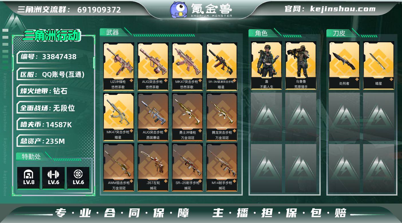总资产235M/哈夫币1458万/传说近战数1/传说枪皮数28/战场等级5/行动等级60/安全箱等时效性道具以游戏内数据为准,详情请看图/乌鲁鲁-荒原猎手/蛊-不羁人生/近战-暗星/近战-处刑者/近战-黑鹰/M4A1突击步枪-阿米娅/AKM突击步枪-锦绣/M16A4突击步枪-狩猎时刻/AUG突击步枪-悠然茶歇/AUG突击步枪-西装暴徒/SG552突击步枪-运动员/SCAR-H战斗步枪-启航/G3战斗步枪-狩猎时刻/CAR-15突击步枪-阿米娅/腾龙突击步枪-捞点薯条/腾龙突击步枪-万金泪冠/K437突击步枪-锦绣/MK47突击步枪-悠然茶歇/MK47突击步枪-暗星/Vector冲锋枪-狩猎时刻/UZI冲锋枪-悠然茶歇/SMG-45冲锋枪-锦绣/SR-3M紧凑突击步枪-暗星/勇士冲锋枪-能天使-午夜邮差/勇士冲锋枪-万金泪冠/M14射手步枪-蛮荒/M14射手步枪-缄花/SR-25射手步枪-缄花/AWM狙击步枪-捞点薯条/AWM狙击步枪-万金泪冠/.357左轮-缄花/93R-捞点薯条/复合弓-黑-天际线/AKM突击步枪-林中猎手/K416突击步枪-腊梅/K416突击步枪-阿萨拉特攻/M16A4突击步枪-竞赛选手/SG552突击步枪-深海恐惧/AS Val突击步枪-百步穿杨/K437突击步枪-丛林谍踪/MP5冲锋枪-竞技风/P90冲锋枪-紧急戒备/Vector冲锋枪-阿萨拉文明/SMG45冲锋枪-阿萨拉特攻/SR-3M紧凑突击步枪-开工大吉/勇...