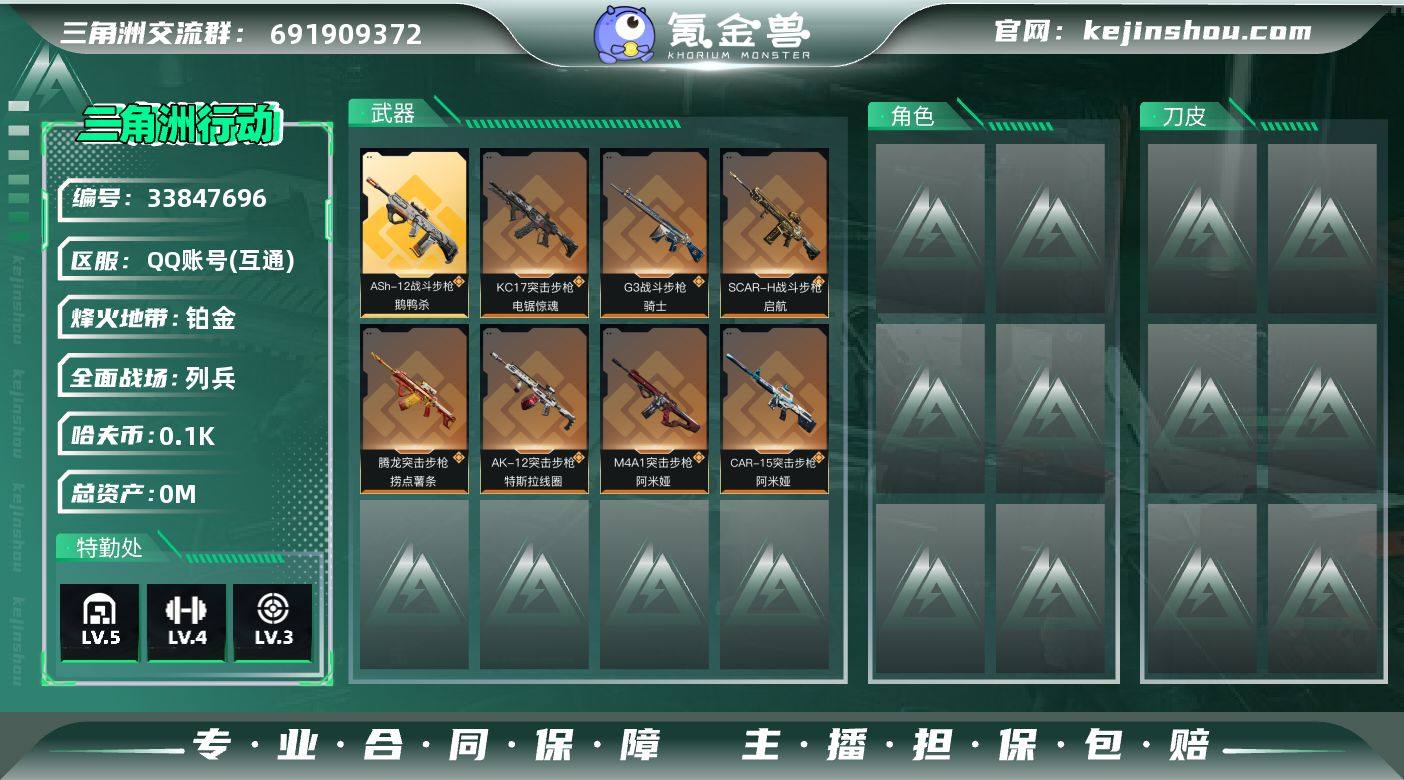 实名: 不可修改 烽火地带段位: 铂金 全面战场段位: 列兵 总资产: 6 哈夫币: 101 传说武器皮肤: M4A1突击步枪-阿米娅,CAR-15突击步枪-阿米娅,腾龙突击步枪-捞点薯条,AK-12突击步枪-特斯拉线圈,SCAR-H战斗步枪-启航,ASh-12战斗步枪-鹅鸭杀,G3战斗步枪-骑士,KC17突击步枪-电锯惊魂