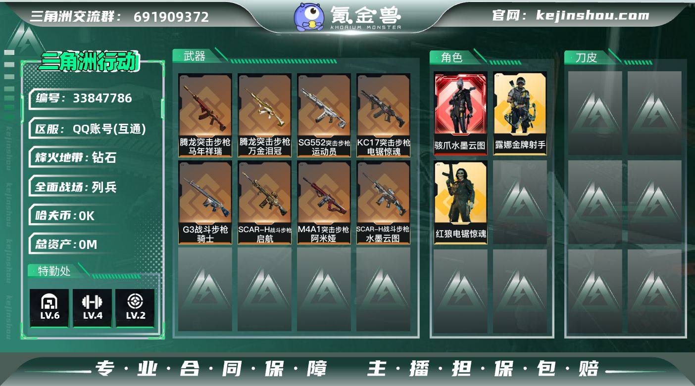 实名: 可修改 烽火地带段位: 钻石 全面战场段位: 列兵 总资产: 33 哈夫币: 5 干员外观: 骇爪-水墨云图,红狼-电锯惊魂,露娜-金牌射手(S7) 传说武器皮肤: SCAR-H战斗步枪-水墨云图,M4A1突击步枪-阿米娅,SCAR-H战斗步枪-启航,G3战斗步枪-骑士,KC17突击步枪-电锯惊魂,SG552突击步枪-运动员,腾龙突击步枪-马年祥瑞,腾龙突击步枪-万金泪冠