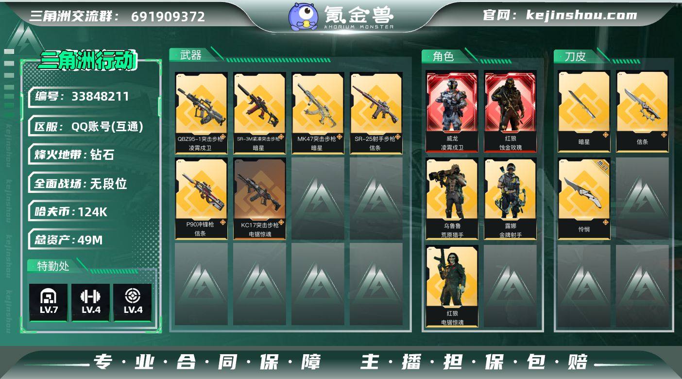 A13130/可二次/QQ区【0封】【总资产:48.9M+近战怜悯+近战信条+近战暗星+红狼蚀金玫瑰+威龙凌霄戍卫】/烽火等级:60级/全面战场:50级/纯币:124K/三角券加币:115(三角币35+三角券80)【近战-怜悯/近战-信条/近战-暗星】【红狼-蚀金玫瑰/威龙-凌霄戍卫】S7/S8通行证/露娜-金牌射手/乌鲁鲁-荒原猎手/部门:11211/特勤等级(技术中心3级/工作台3级/制药台3级/防具台3级/仓库7级/指挥中心3级/训练中心4级/靶场4级/潜水中心1级)M4A1突击步枪-蚀金玫瑰/QBZ95-1突击步枪-凌霄戍卫/KC17突击步枪-电锯惊魂/P90冲锋枪-信条/SR-25射手步枪-信条/MK47突击步枪-暗星/SR-3M紧凑突击步枪-暗星/橙色挂饰x8/段位:钻石III(流动资产:39M)详情看图 ,近战-怜悯,近战-信条,近战-暗星,红狼-蚀金玫瑰,威龙-凌霄戍卫,红狼-电锯惊魂,露娜-金牌射手,乌鲁鲁-荒原猎手,QBZ95-1突击步枪-凌霄戍卫,KC17突击步枪-电锯惊魂,P90冲锋枪-信条,SR-25射手步枪-信条,MK47突击步枪-暗星,SR-3M紧凑突击步枪-暗星