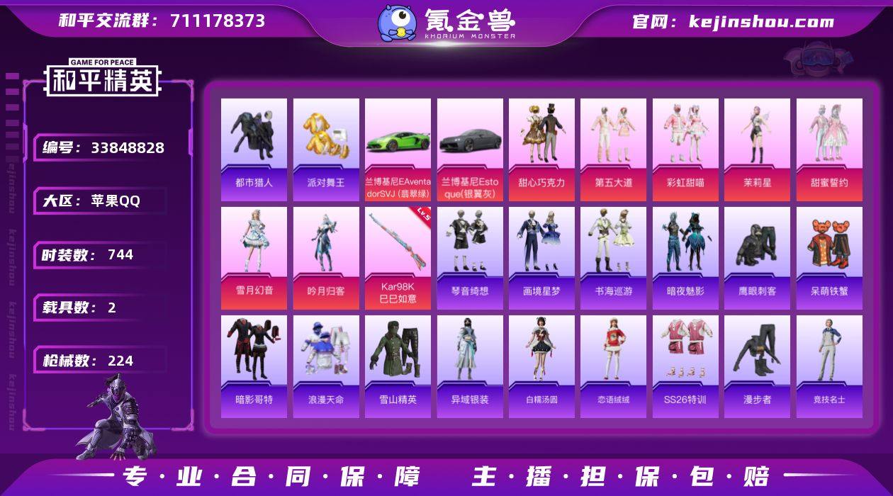 【特价出售】苹果Q-5稀有2载具7粉装4特效枪23热门195套装224枪皮 72603热力值 9印记 历史超级王牌16星 【5稀有】 AKM-缤纷海域 都市猎人 浪漫天命 派对舞王 派对舞王(金靴子) 【2载具】 兰博轿车灰色 兰博SVJ绿色 【7粉装】 茉莉星 甜心巧克力 雪月幻音 第五大道 甜蜜誓约 彩虹甜喵 吟月归客 【4特效枪】 Kar98K-巳巳如意 (5级) 信号枪-金乌曜日 (2级) Mk14-福马献瑞 (5级) UMP45-萌骑冒险 (4级) 【23热门】 龟仙人 青涩年华 雪山精英 软软马卡龙 糯粉咩咩 呆萌铁蟹 鹰眼刺客 NV战队服 梦起落英 怪笑疯兔 暗影哥特 赛罗奥特曼 团圆交子 瑞龙福将 漫步者 冰爽海盐 破蛋小黄鸡 极速红龙 AKM-奇异狩猎者 M762-奇异狩猎者 M762-瑞龙福将 M24-奇异狩猎者 M24-香水柠檬