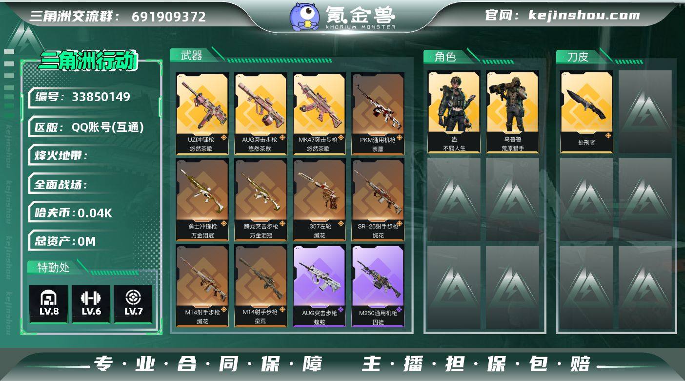 40m总资产-49k哈夫币-60烽火等级-黄金-11战场等级-列兵 【干员外观】:乌鲁鲁-荒原猎手,蛊-不羁人生 【近战皮肤】:近战-处刑者4级,近战-黑鹰 【传说外观】:AUG突击步枪-悠然茶歇,腾龙突击步枪-万金泪冠,MK47突击步枪-悠然茶歇,UZI冲锋枪-悠然茶歇,勇士冲锋枪-万金泪冠,PKM通用机枪-荼蘼,M14射手步枪-蛮荒,M14射手步枪-缄花,SR-25射手步枪-缄花,AWM狙击步枪-万金泪冠,.357左轮-缄花 【史诗外观】:K416突击步枪-腊梅,AUG突击步枪-蝮蛇,G3战斗步枪-哈夫克警备,K437突击步枪-丛影谍踪,Vector冲锋枪-猎鳄行动,SMG-45冲锋枪-阿萨拉特攻,SR-3M紧凑突击步枪-开工大吉,勇士冲锋枪-丛影谍踪,MP7冲锋枪-六套之力,M249轻机枪-丛影谍踪,M250通用机枪-囚徒,QJB201轻机枪-炽焰,VSS射手步枪-丛影谍踪,M14射手步枪-工业狂潮,SV-98狙击步枪-猎鳄行动,M700狙击步枪-哈夫克警备 【稀有外观】:K416突击步枪-一帆风顺,SG552突击步枪-马年新春,SG552突击步枪-贴花艺术, AK-12突击步枪-马年新春,CAR-15突击步枪-来财,KC17突击步枪-来财,MP5冲锋枪-哈夫克卫队,SMG-45冲锋枪-行动开启,SR-3M紧凑突击步枪-马年新春,勇士冲锋枪-冰天雪地,M1014霰弹枪-幻影结构,M...