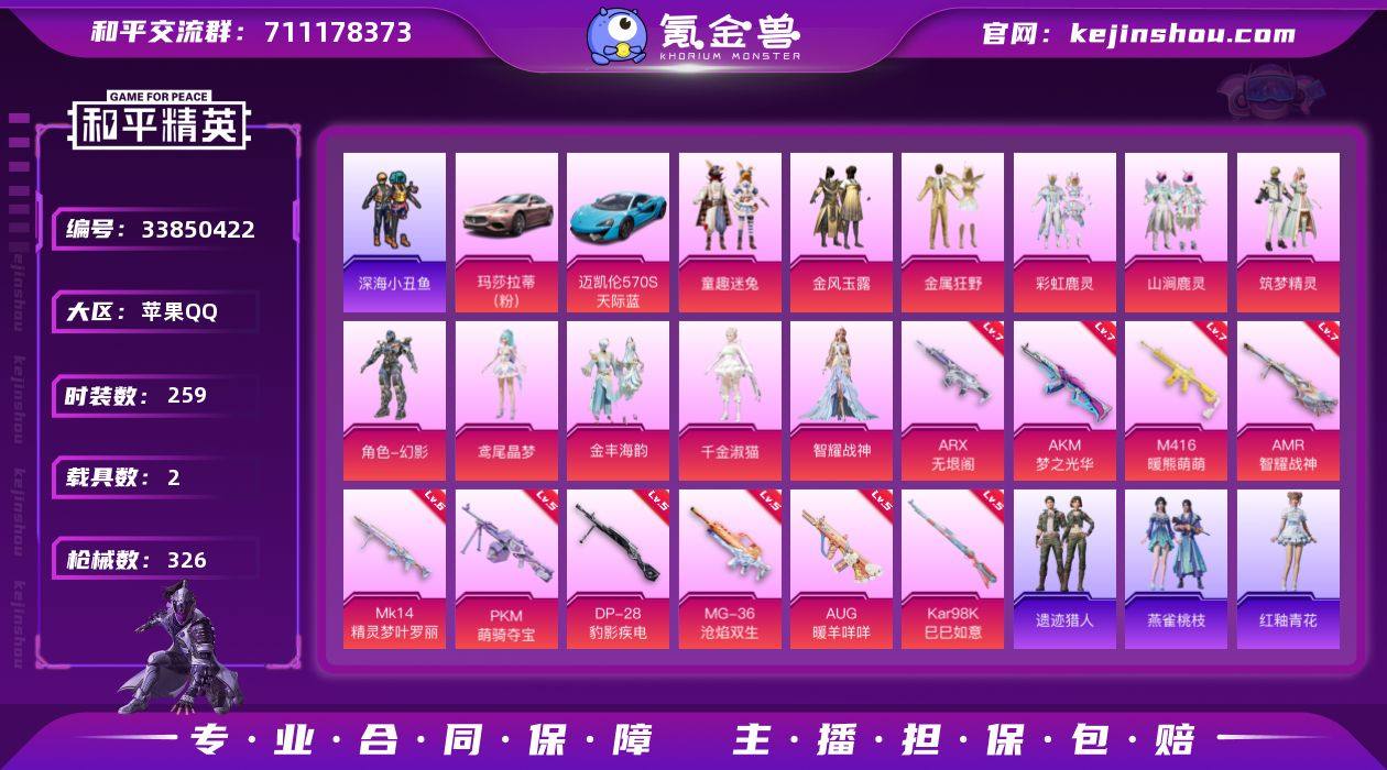 【LHPX2696】21印记【特价出售/店主推荐--热门套装小丑鱼千金淑猫4把七级枪】苹果 手Q-11粉装-10特效枪-2载具-3粉色飞行器-106857热力值-21王牌印记-259套装-326枪皮【热门品类】:粉装-童趣迷兔,绝对防御上衣,套装-深海小丑鱼,套装-小丑鱼,套装-星河浪客【粉色套装】:粉装-金风玉露,粉装-金属狂野,粉装-童趣迷兔,粉装-彩虹鹿灵,粉装-山涧鹿灵,粉装-筑梦精灵,角色-幻影,角色-鸢尾晶梦,粉装-金丰海韵,角色-千金淑猫,角色-智耀战神【粉色枪皮等级】:AKM-梦之光华(七级),M416-暖熊萌萌(七级),AUG-暖羊咩咩(五级),ARX-无垠阁(七级),Kar98K-巳巳如意(五级),Mk14-精灵梦叶罗丽(六级),AMR-智耀战神(七级),DP-28-豹影疾电(五级),PKM-萌骑夺宝(五级),MG-36-沧焰双生(五级)【粉色载具】:玛莎拉蒂Ghibli(粉),迈凯伦570S(天际蓝)【粉色枪皮】:AKM-梦之光华,M416-暖熊萌萌,AUG-暖羊咩咩,ARX-无垠阁,Kar98K-巳巳如意,Mk14-精灵梦叶罗丽,AMR-智耀战神,DP-28-豹影疾电,PKM-萌骑夺宝,MG-36-沧焰双生【粉色飞行器】:炫彩糖果飞行器,歌者泠鸢飞行器