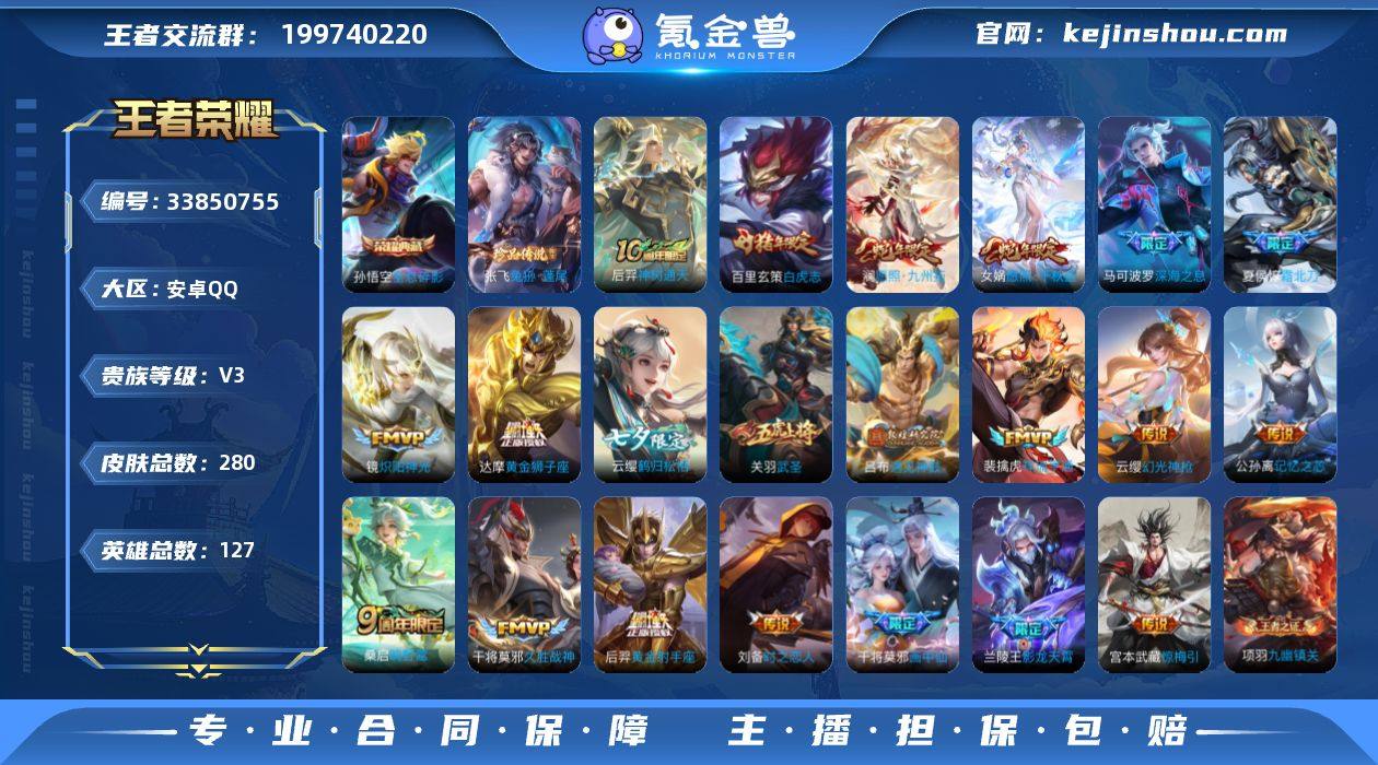【精品推荐·共赏芳华天幕·全息碎影·兔狲蓬尾·时之思念·白虎志·武圣·深海之息·愿照千秋盛·愿照九州拓·惊梅引·画中仙·无二次包过】YXw23638-安卓Q-127英雄-280皮肤-14王者印记-239铭文-贵族积分4w【贵族3】【1典藏·1珍品·1星传说·21传说·1天幕·8按键】【因赛季更新游戏段付以上号为准!】 【荣耀典藏】:孙悟空全息碎影 【珍品传说】:张飞兔狲蓬尾 【星元皮肤】:刘备时之思念 【天幕】:共赏芳华天幕 【传说皮肤】:后羿神树通天,女娲愿照千秋盛,澜愿照九州拓,云缨幻光神枪,裴擒虎祥瑞亨通,桑启鸣野蒿,夏侯惇霜北刀,兰陵王影龙天霄,吕布遇见神鼓,宫本武藏惊梅引,云缨鹤归松栖,公孙离记忆之芯,干将莫邪画中仙,马可波罗深海之息,镜炽阳神光,关羽武圣,刘备时之恋人,干将莫邪久胜战神,达摩黄金狮子座,百里玄策白虎志,后羿黄金射手座 【限定皮肤】:夏侯惇霜北刀,蔡文姬夏日便利店,虞姬夏日便利店,姜子牙天穹之誓,杨戬破阵退雄兵,狄仁杰阴阳师,赵云皇家上将,庄周高山流水,高渐离死亡摇滚,高渐离玩趣恶龙,钟无艳超时空战士,吕布遇见神鼓,元歌云间偶戏,甄姬落雪兰心,马可波罗深海之息,狄仁杰魔术师,狄仁杰万华元夜,达摩星际陆战队,达摩沙漠行僧...