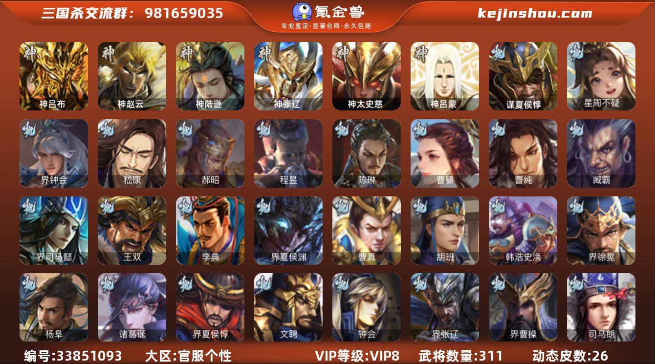 【14790414】官阶:骠骑将军;VIP等级:VIP8;史诗武将数量:37;动态皮肤数量:26;武将总数:311;史诗宝珠数量:7;将魂数量:3552;神将:5;魏国史诗武将:16;蜀国史诗武将:7;吴国史诗武将:3;群史诗武将:14