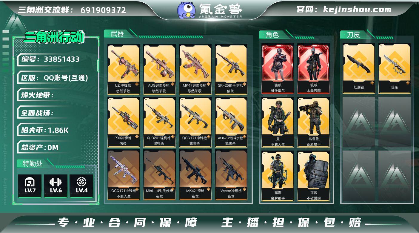 143m总资产-1860k哈夫币-60烽火等级-黑鹰-42战场等级-上等兵 【干员外观】:骇爪-水墨云图,骇爪-维什戴尔,深蓝-不破誓约,露娜-金牌射手,乌鲁鲁-荒原猎手,蛊-不羁人生 【近战皮肤】:近战-信条,近战-处刑者2级,近战-黑鹰 【传说外观】:ASh-12战斗步枪-鹅鸭杀,K416突击步枪-行动记录,AUG突击步枪-悠然茶歇,SG552突击步枪-运动员,SCAR-H战斗步枪-水墨云图,SCAR-H战斗步枪-启航,G3战斗步枪-骑士,CAR-15突击步枪-阿米娅,腾龙突击步枪-万金泪冠,MK47突击步枪-悠然茶歇,P90冲锋枪-信条,Vector冲锋枪-能天使-午夜邮差,Vector冲锋枪-夜莺,UZI冲锋枪-悠然茶歇,SR-3M紧凑突击步枪-冥夜蔷薇,勇士冲锋枪-能天使-午夜邮差,勇士冲锋枪-万金泪冠,QCQ171冲锋枪-鹅鸭杀,QCQ171冲锋枪-不羁人生,MK4冲锋枪-夜莺,M250通用机枪-骑士之心,QJB201轻机枪-鹅鸭杀,Mini-14射手步枪-夜莺,M14射手步枪-蛮荒,SR-25射手步枪-信条,R93狙击步枪-维什戴尔,AWM狙击步枪-万金泪冠 【史诗外观】:QBZ95-1突击步枪-曙光,ASh-12战斗步枪-无极限,K416突击步枪-腊梅,K416突击步枪-阿萨拉特攻,AUG突击步枪-蝮蛇,M7战斗步枪-百步穿杨,SCAR-H战斗步枪-囚徒,G3战斗步枪-流沙送葬,...