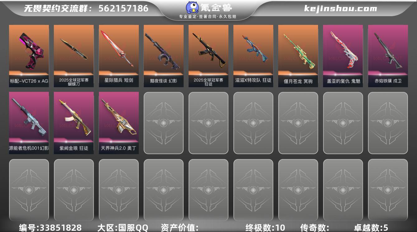 【套装】:2025全球冠军赛套装 【英雄】:炼狱,暮蝶,壹决,铁臂,捷风,不死鸟,贤者,猎枭,蝰蛇,芮娜,尚勃勒,霓虹,斯凯,夜露,K/O,海神,盖可,黑梦 【近战武器】:近战武器-2025全球冠军赛 蝴蝶刀,近战武器-蒙太奇 战斧,近战武器-碎心裂刃,近战武器-剥皮小刀,近战武器-星际猎兵 短剑 【狂徒】:狂徒-2025全球冠军赛,狂徒-滋滋X特攻队,狂徒-紫阙金琅 【幻影】:幻影-黯夜怪谈,幻影-源能者危机001,幻影-蒙太奇 【戍卫】:戍卫-赤焰铁骥 【冥驹】:冥驹-偃月苍龙 【战神】:战神-蒙太奇 【奥丁】:奥丁-天界神兵//2.0 【骇灵】:骇灵-无限竞技,骇灵-蒙太奇 【VCT手枪】:标配-VCT26 x AG 【鬼魅】:鬼魅-盖亚的复仇,鬼魅-宿怨 【狂怒】:狂怒-蒙太奇 【短炮】:短炮-蛇吻 【卡面】:抑制技术 卡面,至黑之夜 卡面,Clutch 卡面,无畏契约:蝰蛇 卡面,脚踝终结者 卡面 ,无畏契约GO!第一卷:芮娜 卡面,无畏契约GO!第一卷:零 卡面,势不可挡//K/O 卡面,代号红色 卡面,新兵报到 卡面,V契约 卡面,无畏契约 卡面 【喷漆】:蝰蛇 喷漆,别挡我的路! 喷漆,致命毒素 喷漆,喜欢哪种毒? 喷漆,买装还是存钱 喷漆,暗中偷瞄 喷漆,胜利属于无畏契约 喷漆...
