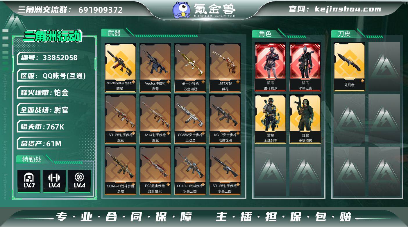 【骇爪双红皮-水墨云图+维什戴尔】【Q区三端互通】【无二次协助处理】YXz9841-特勤处:仓库7级/靶场4级/训练中心4级-61m总资产-76w哈夫币-54烽火等级-铂金-32战场等级-尉官 【干员外观】:骇爪-水墨云图,骇爪-维什戴尔,红狼-电锯惊魂,露娜-金牌射手 【近战皮肤】:近战-处刑者1级,近战-黑鹰 【传说外观】:SG552突击步枪-运动员,SCAR-H战斗步枪-水墨云图,SCAR-H战斗步枪-启航,KC17突击步枪-电锯惊魂,Vector冲锋枪-夜莺,SR-3M紧凑突击步枪-暗星,勇士冲锋枪-万金泪冠,M14射手步枪-蛮荒,M14射手步枪-缄花,SR-25射手步枪-水墨云图,SR-25射手步枪-缄花,R93狙击步枪-维什戴尔,.357左轮-缄花 【史诗外观】:M7战斗步枪-百步穿杨,G3战斗步枪-流沙送葬,AS Val突击步枪-百步穿杨,MP5冲锋枪-战术竞备,MP5冲锋枪-竞技风,Vector冲锋枪-百步穿杨,勇士冲锋枪-工业狂潮,MP7冲锋枪-六套之力,M249轻机枪-丛影谍踪,QJB201轻机枪-炽焰,VSS射手步枪-丛影谍踪,M700狙击步枪-百步穿杨,AWM狙击步枪-流沙送葬 【稀有外观】:M4A1突击步枪-零点,M4A1突击步枪-繁盛,AKM突击步枪-肃杀,QBZ95-1突击步枪-公平竞技,ASh-12战斗步枪-繁盛,K416突击步枪-碳纤维,M7战斗步枪-捣...