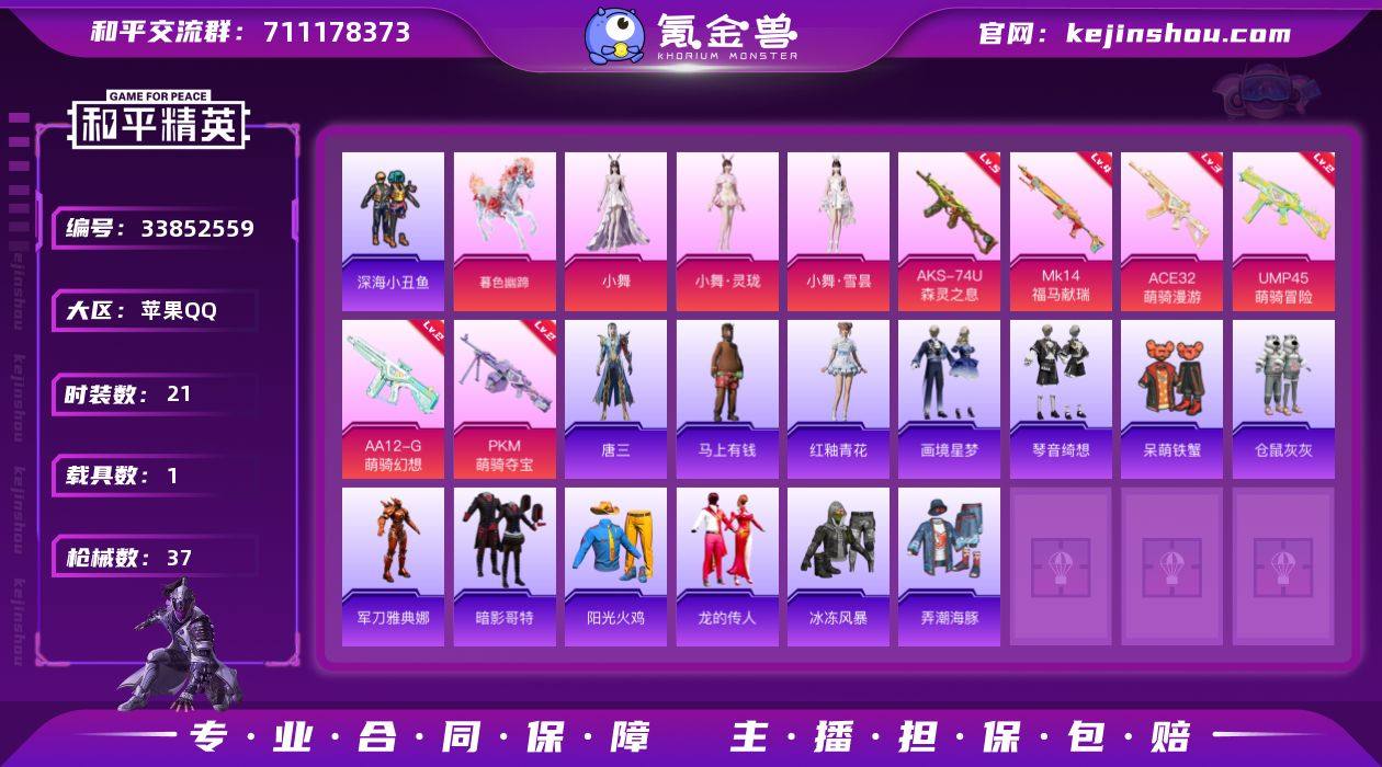 无二次-苹果 手Q-3粉装-6特效枪-1载具-4粉色飞行器-12475热力值-1王牌印记-21套装-37枪皮 【热门品类】:套装-深海小丑鱼,角色-军刀雅典娜,套装-暗影哥特 【粉色套装】:人物-小舞,人物-小舞·灵珑,人物-小舞·雪昙 【粉色枪皮等级】:ACE32-萌骑漫游(三级),UMP45-萌骑冒险(二级),AKS-74U-森灵之息(五级),Mk14-福马献瑞(四级),AA12-G-萌骑幻想(二级),PKM-萌骑夺宝(二级) 【粉色载具】:暮色幽蹄 【粉色枪皮】:ACE32-萌骑漫游,UMP45-萌骑冒险,AKS-74U-森灵之息,Mk14-福马献瑞,AA12-G-萌骑幻想,PKM-萌骑夺宝 【粉色飞行器】:香车宝马飞行器,圣域金龙飞行器,终晖之翼飞行器,灵猫魔法师飞行器 【粉色降落伞】:圣域龙灵降落伞,暮色玫影降落伞,小舞降落伞 【稀有套装】:套装-马上有钱,套装-画境星梦,套装-琴音绮想,套装-雨过天青,套装-红釉青花,角色-唐三 【稀有枪皮】:AKM-环太平洋,M16A4-最终圣卫者,M416-糯团青竹,GROZA-暮色玫影,AUG-甜蜜菠萝,ACE32-画境星梦,UZI-影袭,汤姆逊-像素花束,MP5K-画境星梦,Kar98k-最终圣卫者,AWM-暮色玫影,SKS-迅猛狂鲨,SKS-圣域龙灵,Mini14-穿刺龙虾,M1加兰德-画境星梦,S686-生命誓言,AA12-G-画境星梦,...