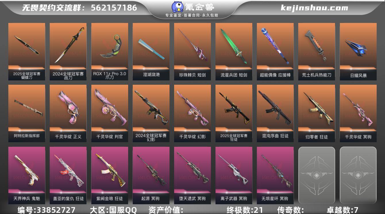 【套装】:2025全球冠军赛套装,2024全球冠军赛套装,千灵华绽套装 【英雄】:幻棱,炼狱,维斯,暮蝶,钛狐,壹决,铁臂,捷风,雷兹,幽影,不死鸟,贤者,猎枭,蝰蛇,零,芮娜,奇乐,尚勃勒,霓虹,斯凯,夜露,星礈,K/O,海神,盖可,黑梦,钢锁 【近战武器】:近战武器-2025全球冠军赛 蝴蝶刀,近战武器-2024全球冠军赛 战刀,近战武器-魔术火花,近战武器-剥皮小刀,近战武器-RGX 11z Pro//3.0 爪刀,近战武器-落英飞旋,近战武器-澄湖潋滟,近战武器-珍珠棘贝 短剑,近战武器-流星兵团 短剑,近战武器-超能偶像 应援棒,近战武器-荒土机兵 热能刀,近战武器-日耀风暴 遗器,近战武器-阿特拉斯指挥部 甩棍,近战武器-魔术火花 【狂徒】:狂徒-2025全球冠军赛,狂徒-归零者,狂徒-混沌序曲,狂徒-盖亚的复仇,狂徒-紫阙金琅,狂徒-超能偶像,狂徒-荒土机兵,狂徒-流星兵团 【幻影】:幻影-2024全球冠军赛,幻影-千灵华绽,幻影-珍珠棘贝,幻影-聚合之力,幻影-纳米打击 【戍卫】:戍卫-超能偶像,戍卫-珍珠棘贝,戍卫-逆冲蛮牛,戍卫-战术熊与伙伴们 【獠犬】:獠犬-采蜜小蜂队,獠犬-复古浪潮,獠犬-逆冲蛮牛 【冥驹】:冥驹-千灵华绽,冥驹-堕天遗武,冥驹-离子武器...