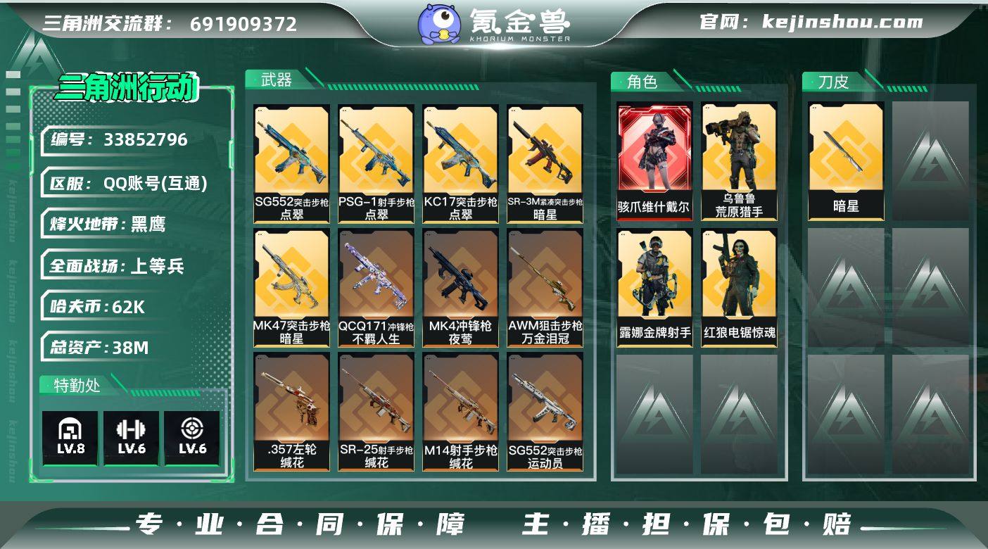 【SJZYT1203】总资产38M/哈夫币6万/传说近战数1/传说枪皮数18/战场等级31/行动等级60/安全箱等时效性道具以游戏内数据为准,详情请看图/骇爪-维什戴尔/红狼-电锯惊魂/露娜-金牌射手(S7)/乌鲁鲁-荒原猎手/近战-暗星/近战-黑鹰/SG552突击步枪-运动员/SG552突击步枪-点翠/SCAR-H战斗步枪-启航/CAR-15突击步枪-阿米娅/KC17突击步枪-电锯惊魂/KC17突击步枪-点翠/MK47突击步枪-暗星/SR-3M紧凑突击步枪-暗星/QCQ171冲锋枪-不羁人生/MK4冲锋枪-夜莺/M250通用机枪-骑士之心/M14射手步枪-蛮荒/M14射手步枪-缄花/SR-25射手步枪-缄花/PSG-1射手步枪-点翠/R93狙击步枪-维什戴尔/AWM狙击步枪-万金泪冠/.357左轮-缄花/SR-25射手步枪-天命(典藏)/腾龙突击步枪-檀劫铳影/QBZ95-1突击步枪-曙光/ASh-12战斗步枪-无极限/K416突击步枪-冬日风情/K416突击步枪-腊梅/K416突击步枪-阿萨拉特攻/AUG突击步枪-蝮蛇/M7战斗步枪-百步穿杨/SG552突击步枪-哈夫克警备/G3战斗步枪-流沙送葬/G3战斗步枪-哈夫克警备/AS Val突击步枪-百步穿杨/腾龙突击步枪-猎鳄行动/腾龙突击步枪-聚光灯/K437突击步枪-守护者/K437突击步枪-丛林谍踪/MP5冲锋枪-战术竞备/MP5冲锋枪-竞技风/Vector冲锋枪-百步穿杨/SR-3M紧凑突击步枪...