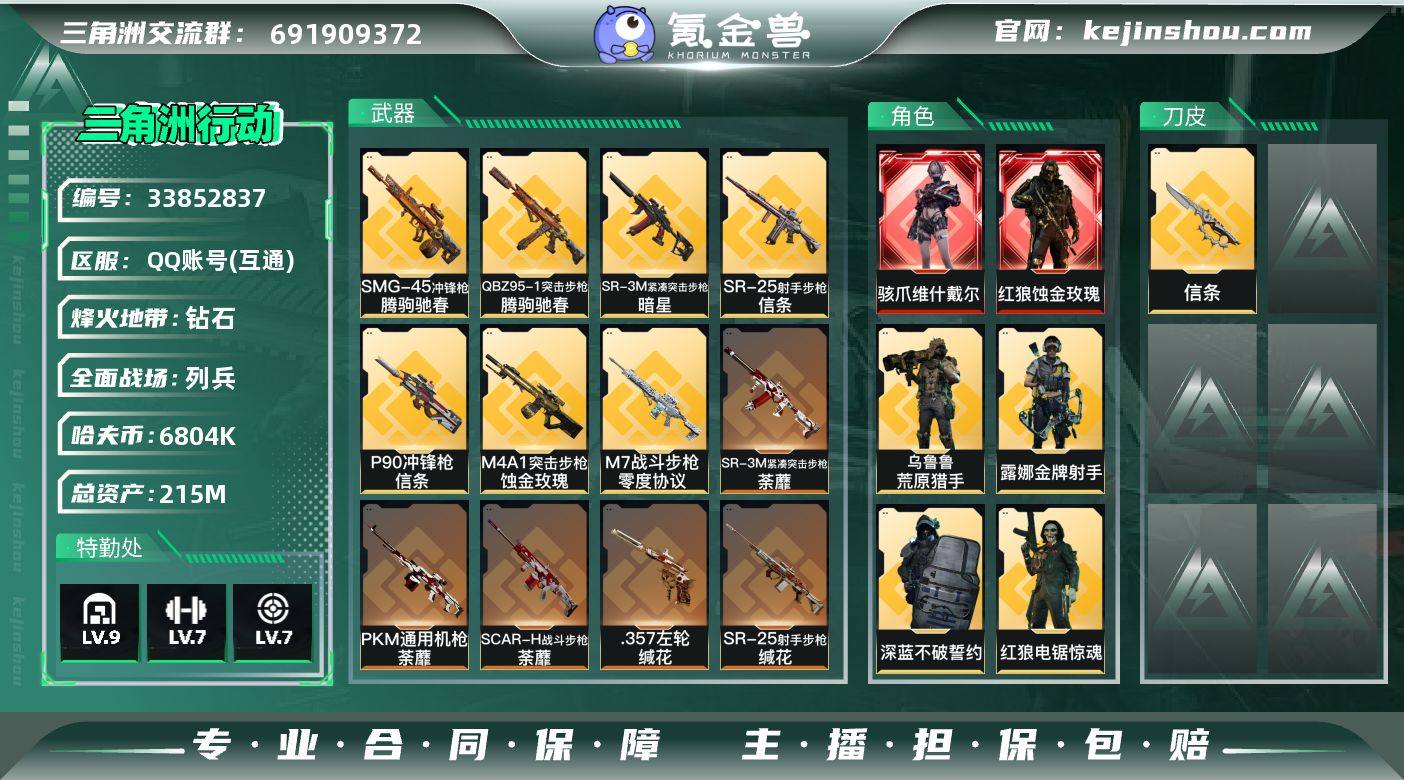 编号A01606 不可二次(社交限制 不影响游戏)等级60 总资产215.4M 流动资产126M 哈夫币6804K 1刀 1红皮 基础安全箱 仓库lv9 训练中心lv7 靶场lv7 信条 蚀金玫瑰
