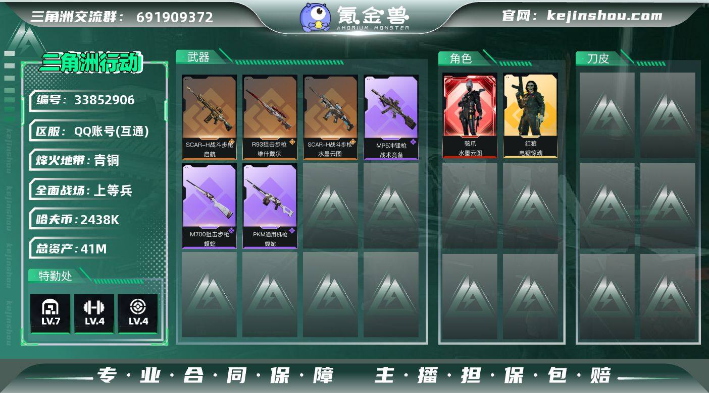 编号A01607 不可二次(社交限制 不影响游戏) 等级60 总资产41M 流动资产30.3M 哈夫币2438K 基础安全箱 仓库lv7 训练中心lv4 靶场lv4 水墨云图