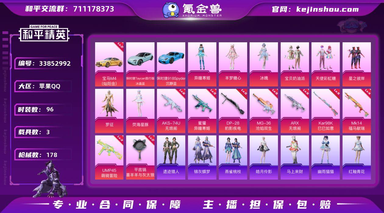 【LHPX2619】【特价出售/店主推荐--载具宝马m4】苹果 手Q-8粉装-9特效枪-3载具-3粉色飞行器-58188热力值-6王牌印记-96套装-178枪皮【红色载具】:宝马M4(灿阳金)(二级)【热门品类】:套装-龟仙人,套装-粉红小猪【粉色套装】:粉装-宝贝奶油派,粉装-天使彩虹糖,粉装-星之彼岸,角色-罗征,角色-荧海星豚,角色-冰魄,角色-羊梦糖心,角色-异瞳寒姬【粉色枪皮等级】:蜜獾-异瞳寒姬(五级),ARX-无垠阁(五级),UMP45-萌骑冒险(三级),AKS-74U-无垠阁(六级),Kar98K-巳巳如意(五级),Mk14-福马献瑞(四级),DP-28-豹影疾电(五级),MG-36-沧焰双生(五级),平底锅-喜羊羊与灰太狼(二级)【粉色载具】:宝马M4(灿阳金),保时捷Taycan 旅行版(冰晶蓝),保时捷918 Spyder(沉静蓝)【粉色枪皮】:蜜獾-异瞳寒姬,ARX-无垠阁,UMP45-萌骑冒险,AKS-74U-无垠阁,Kar98K-巳巳如意,Mk14-福马献瑞,DP-28-豹影疾电,MG-36-沧焰双生,平底锅-喜羊羊与灰太狼【粉色飞行器】:炫彩糖果飞行器,冠军兔兔飞行器,彩虹独角兽飞行器