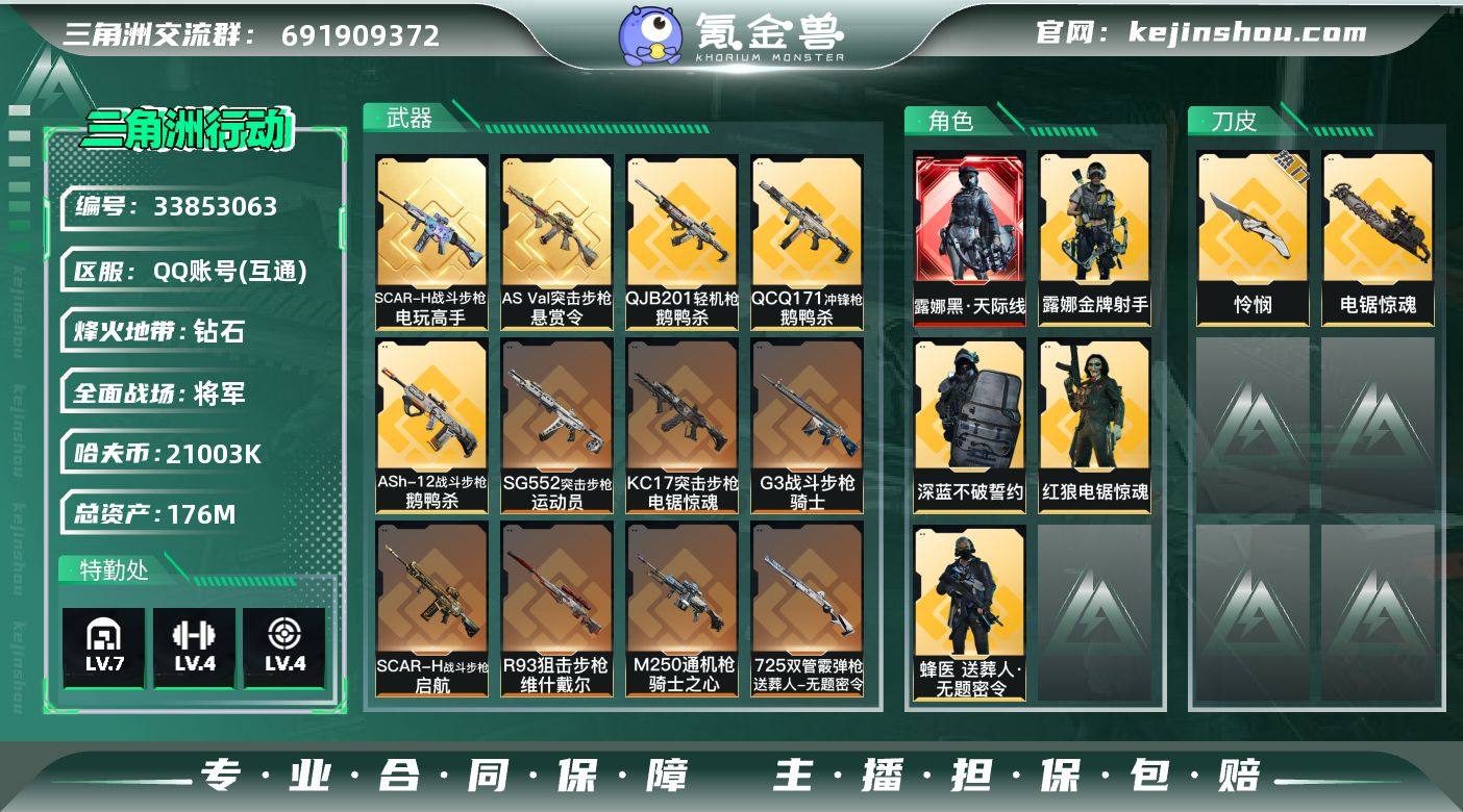 176m总资产-21003k哈伏币-60烽火等级-钻石-50战场等级-将军 SM9012 【干员外观】:露娜-黑·天际线,蜂医-送葬人·无题密令,深蓝-不破誓约,红狼-电锯惊魂,露娜-金牌射手 【近战皮肤】:近战-怜悯,近战-电锯惊魂,近战-黑鹰 【典藏外观】:SCAR-H战斗步枪-电玩高手,AS Val突击步枪-悬赏令 【传说外观】:M4A1突击步枪-阿米娅,ASh-12战斗步枪-鹅鸭杀,M16A4突击步枪-狩猎时刻,SG552突击步枪-运动员,AK-12突击步枪-特斯拉线圈,SCAR-H战斗步枪-启航,G3战斗步枪-狩猎时刻,G3战斗步枪-骑士,CAR-15突击步枪-阿米娅,KC17突击步枪-电锯惊魂,Vector冲锋枪-狩猎时刻,UZI冲锋枪-特斯拉线圈,SR-3M紧凑突击步枪-特斯拉线圈,勇士冲锋枪-能天使-午夜邮差,QCQ171冲锋枪-鹅鸭杀,725双管霰弹枪-送葬人-无题密令,M250通用机枪-骑士之心,QJB201轻机枪-鹅鸭杀,R93狙击步枪-维什戴尔,复合弓-黑·天际线 【史诗外观】:P90冲锋枪-暗鸦,AKM突击步枪-林中猎手,QBZ95-1突击步枪-曙光,ASh-12战斗步枪-无极限,M16A4突击步枪-竞赛选手,AUG突击步枪-蝮蛇,M7战斗步枪-百步穿杨,SG552突击步枪-深海恐惧,SCAR-H战斗步枪-囚徒,G3战斗步枪-流沙送葬,PTR-32突击步枪-工业狂潮,AS V...