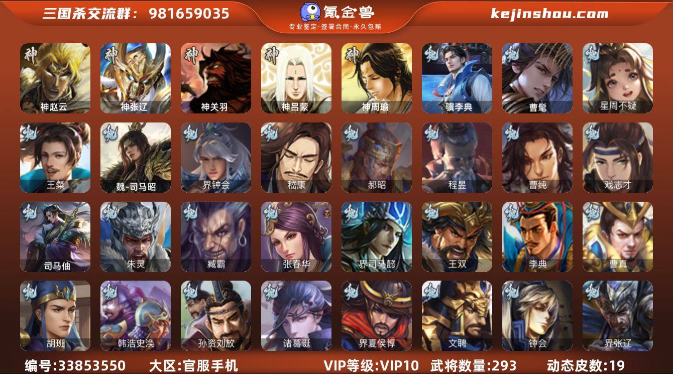 VIP等级: VIP10 官阶: 骠骑将军 武将数量: 293 动态皮肤数量: 19 神将: 神张辽,神赵云,神关羽,神吕蒙,神周瑜 魏国武将: 戏志才,曹纯,程昱,郝昭,嵇康,界钟会,魏-司马昭,王粲,唐咨-魏,张辽,SP蔡文姬,SP关羽,SP贾诩,SP姜维,SP庞德,卞夫人,蔡贞姬,曹昂,曹操,曹冲,曹洪,曹丕,曹仁,曹叡,曹嵩,王异,张恭,鲁芝,界满宠,界曹植,满宠,荀攸,王基,钟繇,郭嘉,牵招,荀彧,界郭嘉,崔琰,界荀彧,朱灵,界甄姬,吕虔,界王异,华歆,陈群,界曹休,司马孚,乐进,郭淮,界曹彰,郭皇后,夏侯惇,曹植,司马朗,界曹操,星周不疑,许褚,界张辽,张郃,钟会,文聘,曹彰,界夏侯惇,诸葛诞,司马懿,甄姬,徐晃,孙资刘放,韩浩史涣,胡班,曹真,典韦,谋荀彧,夏侯渊,李典,于禁,王双,邓艾,界司马懿,张春华,臧霸,朱灵(国战),曹髦,司马伷,骥李典 蜀国武将: 花鬘,谯周,赵襄,谋赵云,谋黄月英,徐庶,杨仪,吕凯,界关羽,界伊籍,界张嶷,赵云,张松,彭羕,界刘备,谋法正,刘封,糜竺,谋庞统,黄月英,关羽,王甫赵累,吴懿,祝融,张飞,黄皓,魏延,谋祝融,马忠,界法正,糜夫人,刘禅,界赵云,关银屏,SP孙尚香,SP徐庶,卧龙诸葛,宗预,周仓,简雍,谋孟获,界关兴张苞,诸葛亮,界张飞,法正,界简雍,界马岱,关平,马岱,界庞统,庞统,诸葛果,谋张飞,马谡,马超,廖化,关兴张...