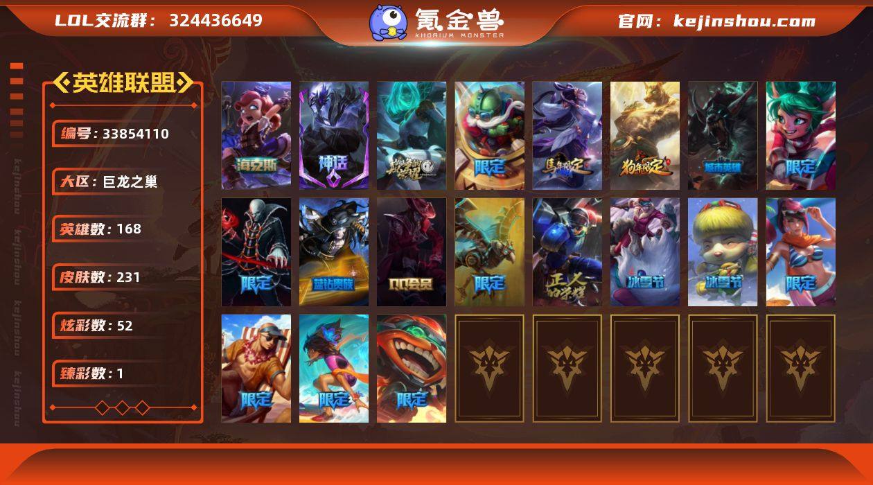 t40357 皇冠账号【巨龙之巢】231皮肤 52炫彩 1臻彩 5神话/35限定/29传说/168英雄 账号等级:600 【重要头像】爱意绵绵 幼犬内瑟斯 幼犬沃里克 不错哦 【重要皮肤】灰烬杀手塞拉斯 海克斯科技安妮 胜利女神娑娜 胜利之王泰达米尔 胜利巨口克格莫 海珀利安小队Y03权天使卡蜜尔 星之守护者佐伊 北辰之威内瑟斯 广寒仙子嫦娥 胜利机器人布里茨 胜利枪神格雷福斯 胜利枪神卢锡安 胜利之剑亚托克斯 魄罗骑士瑟庄妮 泳池派对塔莉垭 泳池派对菲奥娜 泳池派对李青 SKTT1辛德拉 暗杀星蒙多 Fnatic古拉加斯 防暴天使凯尔 钢铁之翼艾尼维亚 鬼影重重魔腾 海贼瑞兹 红桃杰克崔斯特 蓝色忧郁崔斯特 圣诞开心鬼提莫 圣诞狂欢努努和威朗普 圣诞驯鹿克格莫 外星装甲库奇 幸福女神乐芙兰 暗影沃里克 诺斯费拉图弗拉基米尔 阿木木主人不要我了 波比的巧克力工坊 十周年纪念安妮 源代码乐芙兰 神凰行者瑞羽圣凰艾尼维亚 胜利凤凰艾尼维亚 绝息圣堂洛 【传说皮肤】星之守护者卡莎 钢铁之翼凯尔 绅士科加斯 苍穹之光韦鲁斯 天煞劫 西部天使艾希 女帝卡特琳娜 真实伤害艾克 黎明使者锐雯 星之守护者阿卡丽 神拳李青 约德尔国队长提莫 大天...