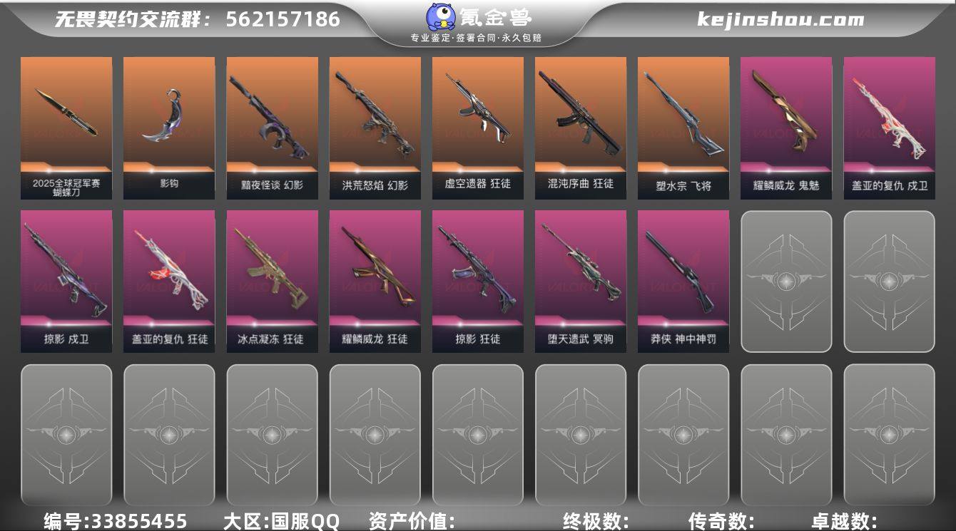 【套装】:2025全球冠军赛套装,掠影//2.0套装,耀鳞威龙套装,掠影套装 【英雄】:幻棱,炼狱,维斯,暮蝶,钛狐,壹决,铁臂,捷风,雷兹,幽影,不死鸟,贤者,猎枭,蝰蛇,零,芮娜,奇乐,尚勃勒,霓虹,斯凯,夜露,星礈,K/O,海神,盖可,黑梦,钢锁 【近战武器】:近战武器-2025全球冠军赛 蝴蝶刀,近战武器-影钩,近战武器-紫金爪刀,近战武器-RGX 11z Pro//3.0 爪刀,近战武器-威龙之刃,近战武器-珍珠棘贝 短剑,近战武器-流星兵团 短剑,近战武器-钢轨卫士 战锤,近战武器-弧光异彩 军刀,近战武器-夜刃诡镰,近战武器-影刃 【狂徒】:狂徒-2025全球冠军赛,狂徒-归零者,狂徒-混沌序曲,狂徒-塑水宗,狂徒-虚空遗器,狂徒-超时空卫队,狂徒-般若假面//2.0,狂徒-冰点凝冻,狂徒-掠影,狂徒-盖亚的复仇,狂徒-耀鳞威龙,狂徒-钢轨卫士,狂徒-弧光异彩,狂徒-流星兵团 【幻影】:幻影-黯夜怪谈,幻影-洪荒怒焰,幻影-异鳞魔蛇,幻影-掠影//2.0,幻影-噬源兽防卫工程,幻影-珍珠棘贝,幻影-战术小伙伴 【戍卫】:戍卫-掠影,戍卫-盖亚的复仇,戍卫-钢轨卫士,戍卫-珍珠棘贝,戍卫-彩梦之城,戍卫-战术熊与伙伴们 【獠犬】:獠犬-弧光异彩,獠犬-复古浪潮,獠犬-战...