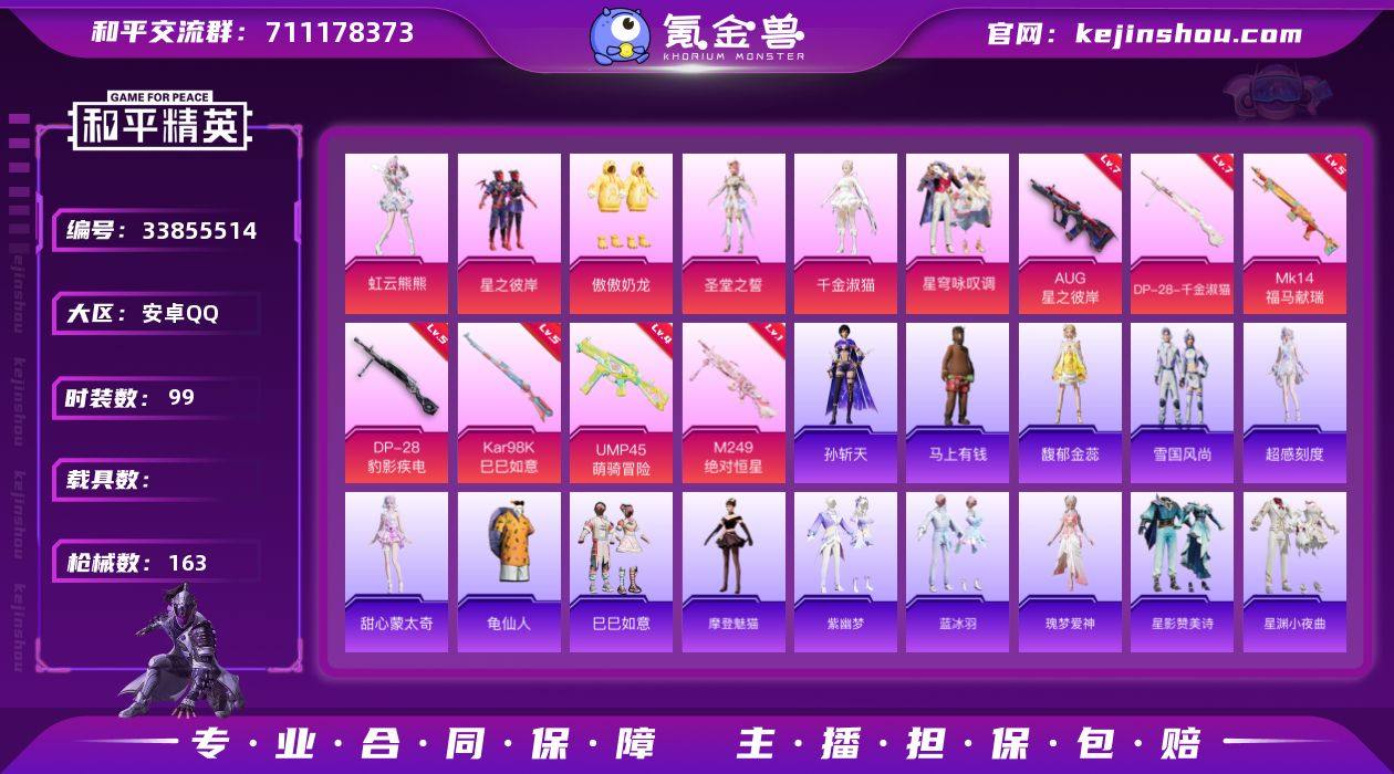安卓 手Q-6粉装-7特效枪-0载具-2粉色飞行器-44491热力值-2王牌印记-99套装-163枪皮 【热门品类】:套装-龟仙人 【粉色套装】:粉装-星之彼岸,粉装-傲傲奶龙,角色-圣堂之誓,角色-千金淑猫,粉装-星穹咏叹调,角色-虹云熊熊 【粉色枪皮等级】:AUG-星之彼岸(七级),UMP45-萌骑冒险(四级),Kar98K-巳巳如意(五级),Mk14-福马献瑞(五级),M249-绝对恒星(一级),DP-28-千金淑猫(七级),DP-28-豹影疾电(五级) 【粉色枪皮】:AUG-星之彼岸,UMP45-萌骑冒险,Kar98K-巳巳如意,Mk14-福马献瑞,M249-绝对恒星,DP-28-千金淑猫,DP-28-豹影疾电 【粉色飞行器】:炫彩糖果飞行器,星之彼岸飞行器 【粉色降落伞】:绝对恒星降落伞,星之彼岸降落伞,闲梦青缨降落伞,圣堂之誓降落伞,千金淑猫降落伞,智耀战神降落伞,星穹咏叹调降落伞,幻彩电音降落伞,绯穹魔姬降落伞,炫彩糖果降落伞,霁蓝缠春降落伞,罪夜之冕降落伞 【稀有套装】:套装-龟仙人,套装-巳巳如意,角色-超感刻度,角色-甜心蒙太奇,套装-雪国风尚,套装-炫彩糖果,套装-马上有钱,角色-摩登魅猫,套装-紫幽梦,套装-蓝冰羽,角色-瑰梦爱神,套装-星影赞美诗,套装-星渊小夜曲,套装-霓虹热舞,套装-云朵鹅,套装-雪...