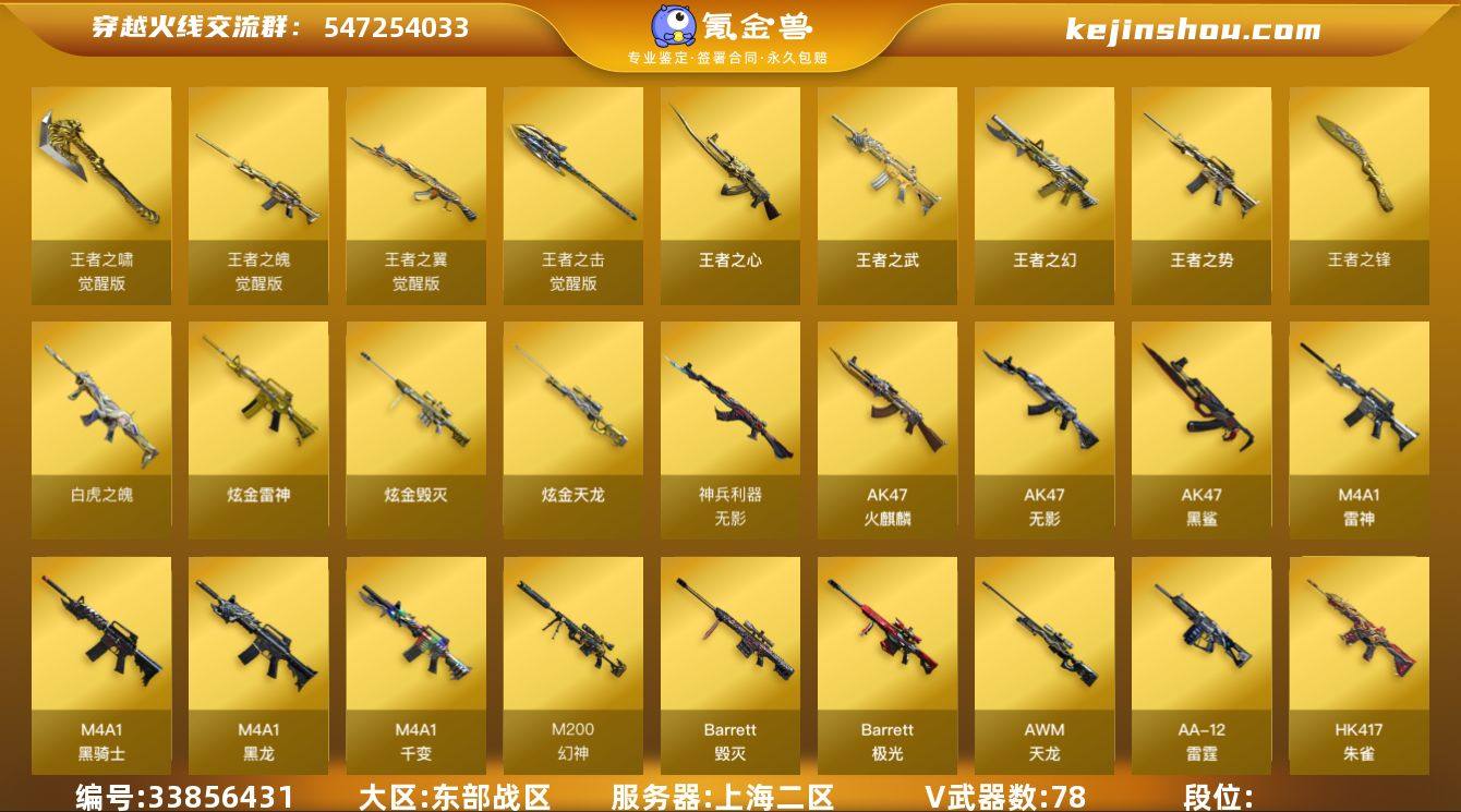 E194754(白虎三件套+幻神带皮)cf东部/上海二区/78V/幻神+黄忠/白虎+大汉风骨+白虎音效卡+白虎之魄/神工天巧套/USP神工天巧*3/黑骑士*3/炼狱*2/玄武+朱雀/暗夜审判(四防)/多皮可排