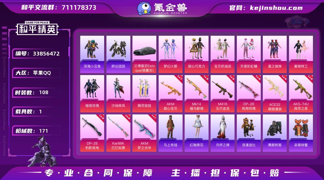 【A9480】苹果【枪皮号 AKM-甜心宝贝(七级)/AKM-梦之光华(一级)/M416-五爪金龙(五级)/粉装-梦幻火箭/粉装-甜心巧克力/兰博基尼Estoque(银翼灰)/百万伏特背包】 手Q-9粉装-9特效枪-1载具-3粉色飞行器-55954热力值-6王牌印记-108套装-171枪皮 【热门品类】:粉装-梦幻火箭,套装-浪漫天命,套装-深海小丑鱼,套装-小丑鱼,套装-胖达团团,套装-浪漫波比 【粉色套装】:粉装-甜心巧克力,粉装-宝贝奶油派,粉装-天使彩虹糖,粉装-梦幻火箭,粉装-星之彼岸,粉装-蜜桃特工,粉装-暗夜玫瑰,粉装-沙场疾风,粉装-精灵娃娃 【粉色枪皮等级】:AKM-甜心宝贝(七级),AKM-梦之光华(一级),M416-五爪金龙(五级),ACE32-萌骑漫游(四级),AKS-74U-森灵之息(四级),Kar98K-巳巳如意(四级),Mk14-福马献瑞(五级),DP-28-枪炮玫瑰(五级),DP-28-豹影疾电(四级) 【粉色载具】:兰博基尼Estoque(银翼灰) 【粉色枪皮】:AKM-甜心宝贝,AKM-梦之光华,M416-五爪金龙,ACE32-萌骑漫游,AKS-74U-森灵之息,Kar98K-巳巳如意,Mk14-福马献瑞,DP-28-枪炮玫瑰,DP-28-豹影疾电 【粉色飞行器】:炫彩糖果飞行器,梦幻火箭飞行器,风花雪月飞行器 【粉色降落伞】:百万伏特降落伞,甜心宝贝降落伞,...