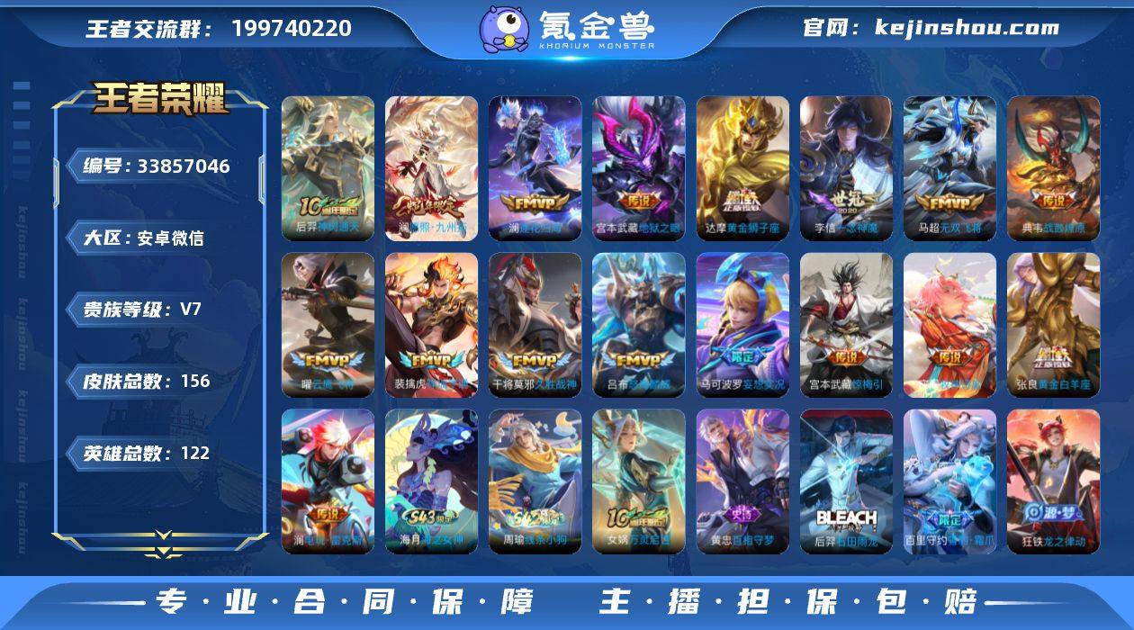 实名: 可修改 性别: 男号 贵族等级: V7 英雄数: 122 皮肤数: 156 传说皮: 黄金狮子座,云鹰飞将,黄金白羊座,久胜战神,一念神魔,地狱之眼,无双飞将,电玩·雷克斯,妄想实况,惊梅引,澜逐花归海,典韦战鼓燎原,牧神诗旅,祥瑞亨通,神树通天 限定皮: 百木心枪,梦圆繁星,怒海麟威,山海·玄木吟,愿照·九州拓 亮点: 【优质装备】:黄金狮子座,云鹰飞将(小将军),黄金白羊座,久胜战神,一念神魔,地狱之眼,无双飞将,电玩·雷克斯,妄想实况,惊梅引,澜逐花归海,牧神诗旅