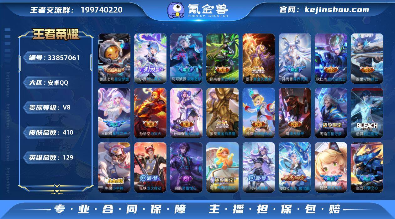 【WZQQ1】贵族等级8/荣耀典藏数量2/传说皮肤数量18/史诗皮肤数量117/皮肤数量410/英雄数量129/段位最强王者/墨子全皮/刘禅全皮/刘邦全皮/孙权全皮/狂铁全皮/盾山全皮/敖隐全皮/戈娅全皮/空空儿全皮/影全皮/鲁班七号-星空梦想/吕布千魇归渊/小乔-时之魔女/狄仁杰神骥赴朔漠/后羿神树通天/桑启-鸣野蒿/墨子-黄金天蝎座/孙膑-小动物乐团/吕布-怒海麟威/王昭君-星穹之声/百里守约-碎云/孙尚香-音你闪耀/马可波罗-深海之息/鲁班七号-寅虎·瑞焰/孙尚香-异界灵契/铠-绛天战甲/虞姬-启明星使/张良-黄金白羊座/孙尚香-末日机甲/孙悟空-地狱火/狄仁杰-超时空战士/白起-狰/姜子牙-天穹之誓/狄仁杰-阴阳师/虞姬-凯尔特女王/赵云-皇家上将/赵云-引擎之心/墨子-神迹守卫/墨子-降魔/妲己-时之奇旅/嬴政-优雅恋人/孙尚香-蔷薇恋人/鲁班七号-狮舞东方/庄周-高山流水/高渐离-死亡摇滚/阿轲-迷踪丽影/钟无艳-超时空战士/孙膑-妖精王/孙膑-寅虎·展翼/扁鹊-炼金王/扁鹊-奇幻香踪/白起-夜都怪侠/芈月-重明/芈月-幻夜卜梦/吕布-猎兽之王/周瑜-赤莲之焰/元歌-云间偶戏/元歌-无心/夏侯惇-朔风刀/甄姬-游园惊梦/甄姬-落雪兰心/曹操-烛龙/典韦-穷奇/典韦-蓝屏警告/马可波罗-暗影游猎/马可波罗-山海·玄木吟...